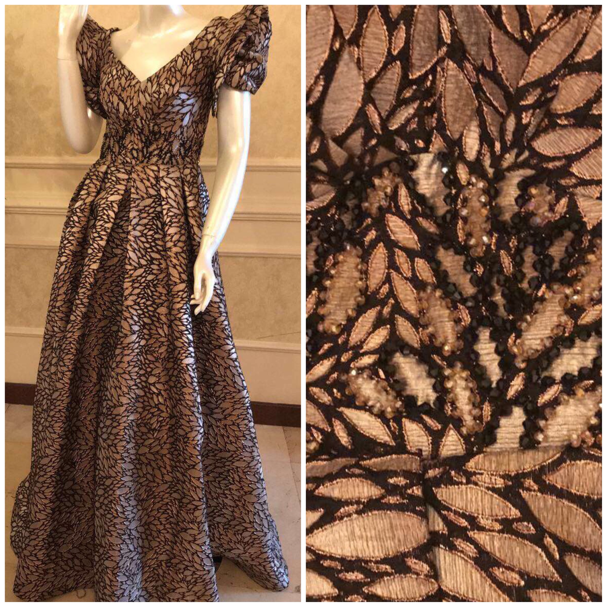 فستان سهرة جديد براند تركي مقاس سمول القماس جاكار اسود في برونزي والتطريز خرز اللون اسوف ف برونزي السعر 500 ريال