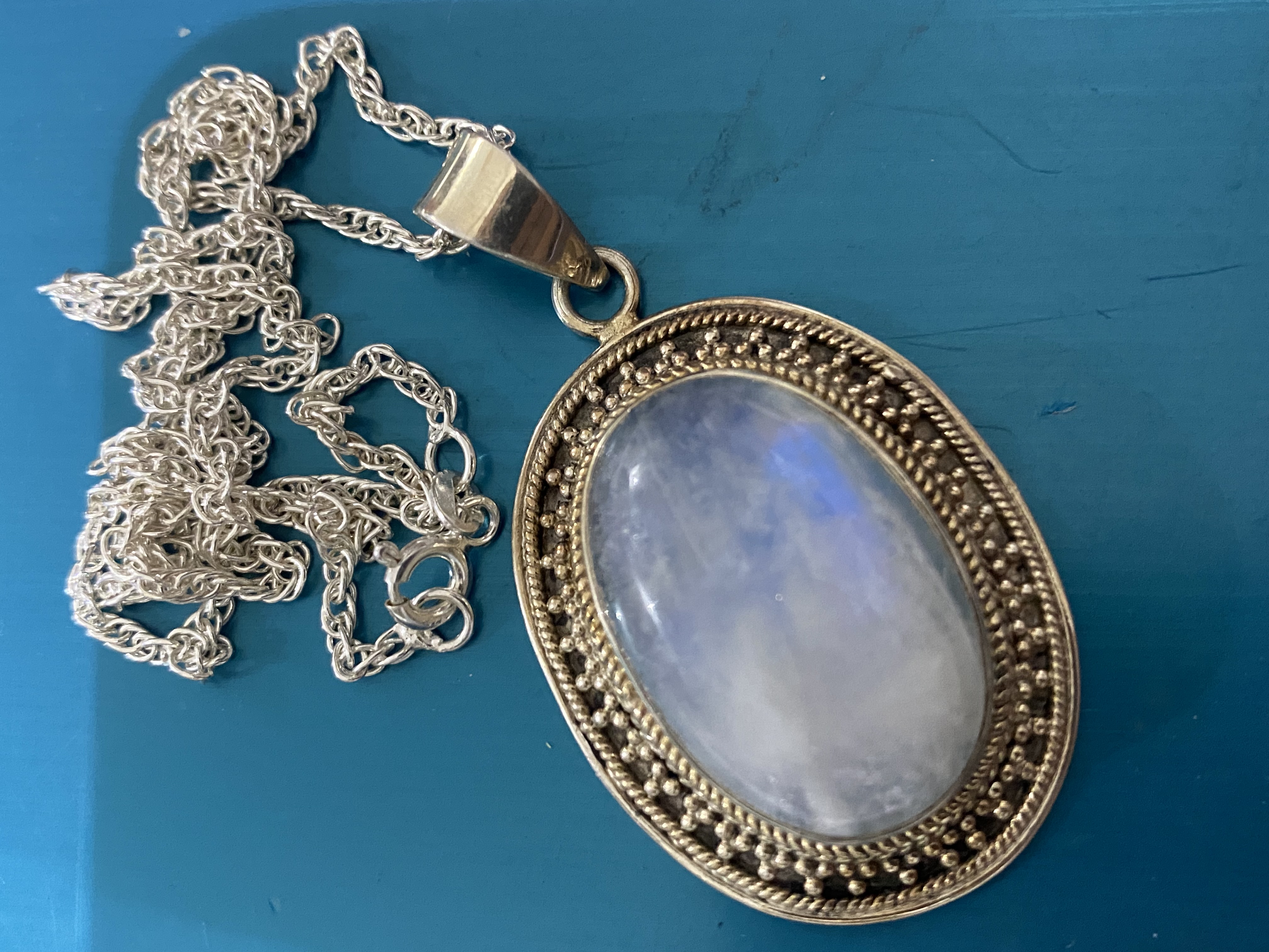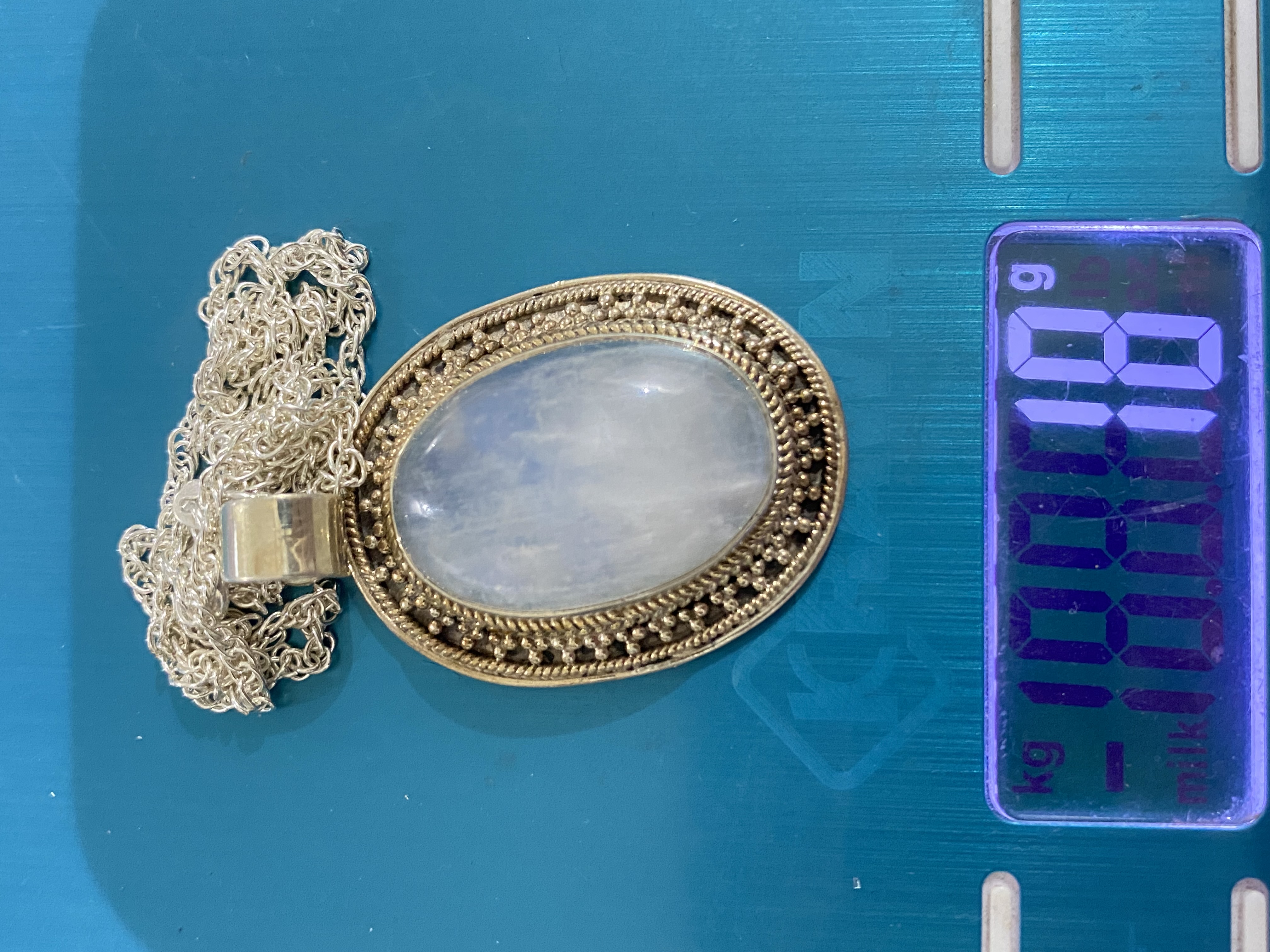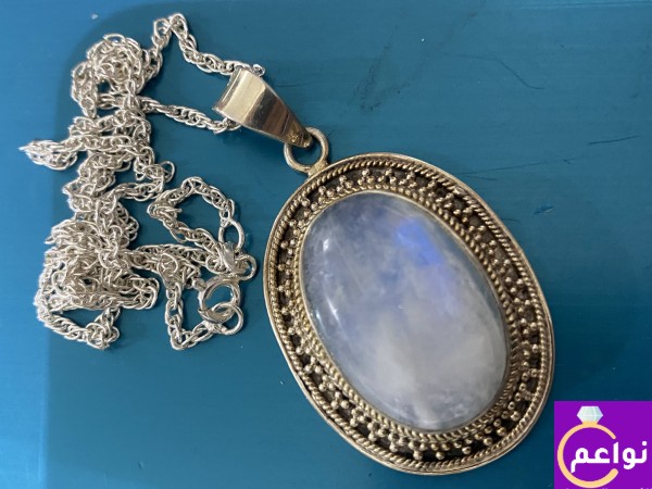 اقدم لكم حجر القمر الطبيعي بقلادة تفصيل فضة وسلسلة عيار 925 - لمحبي التميز والنوادر - وزنها / 18 جرام - بحجم راهي أبعاد الحجر ( 2ونص سم في 3ونص سم ) .
