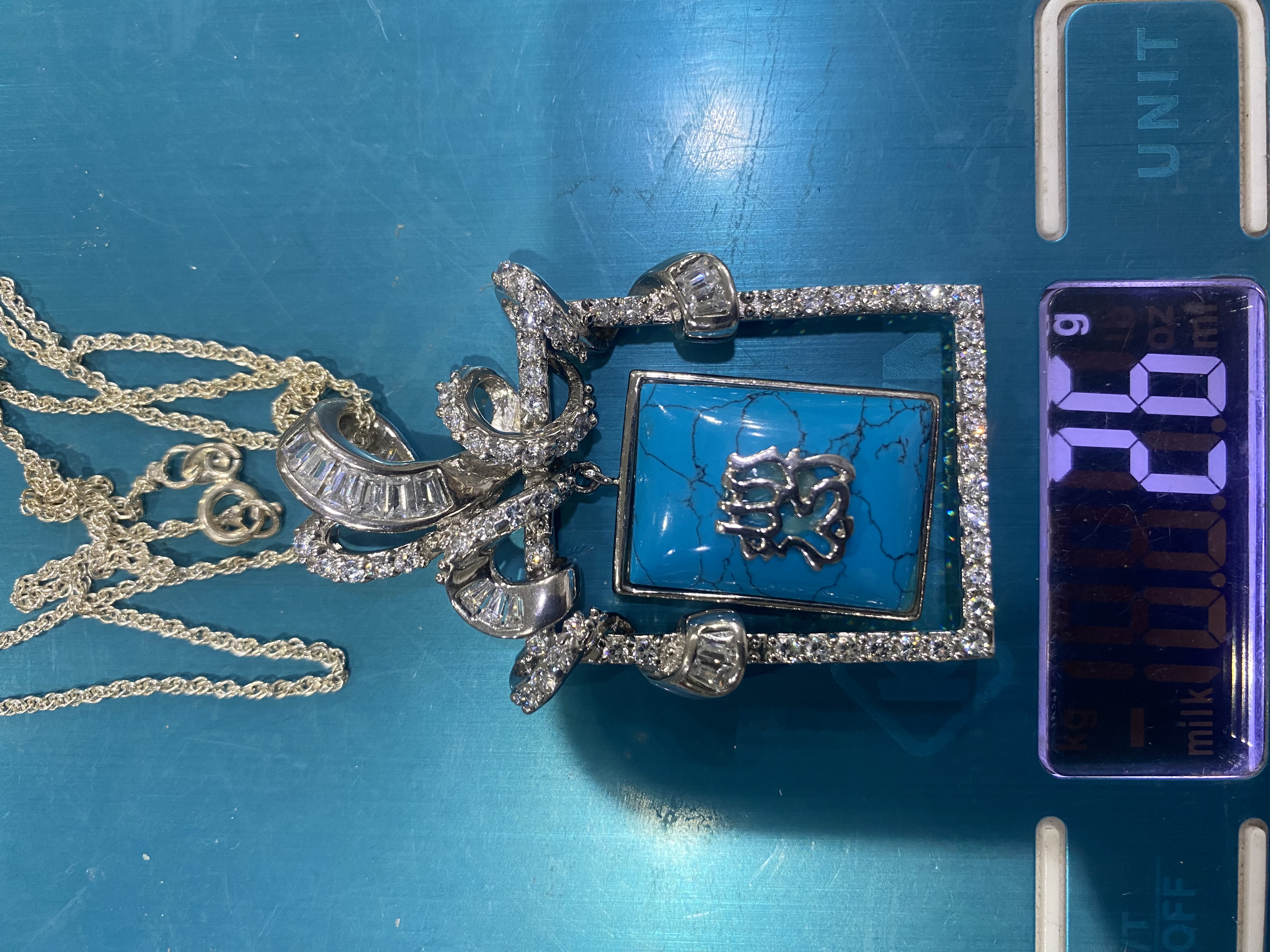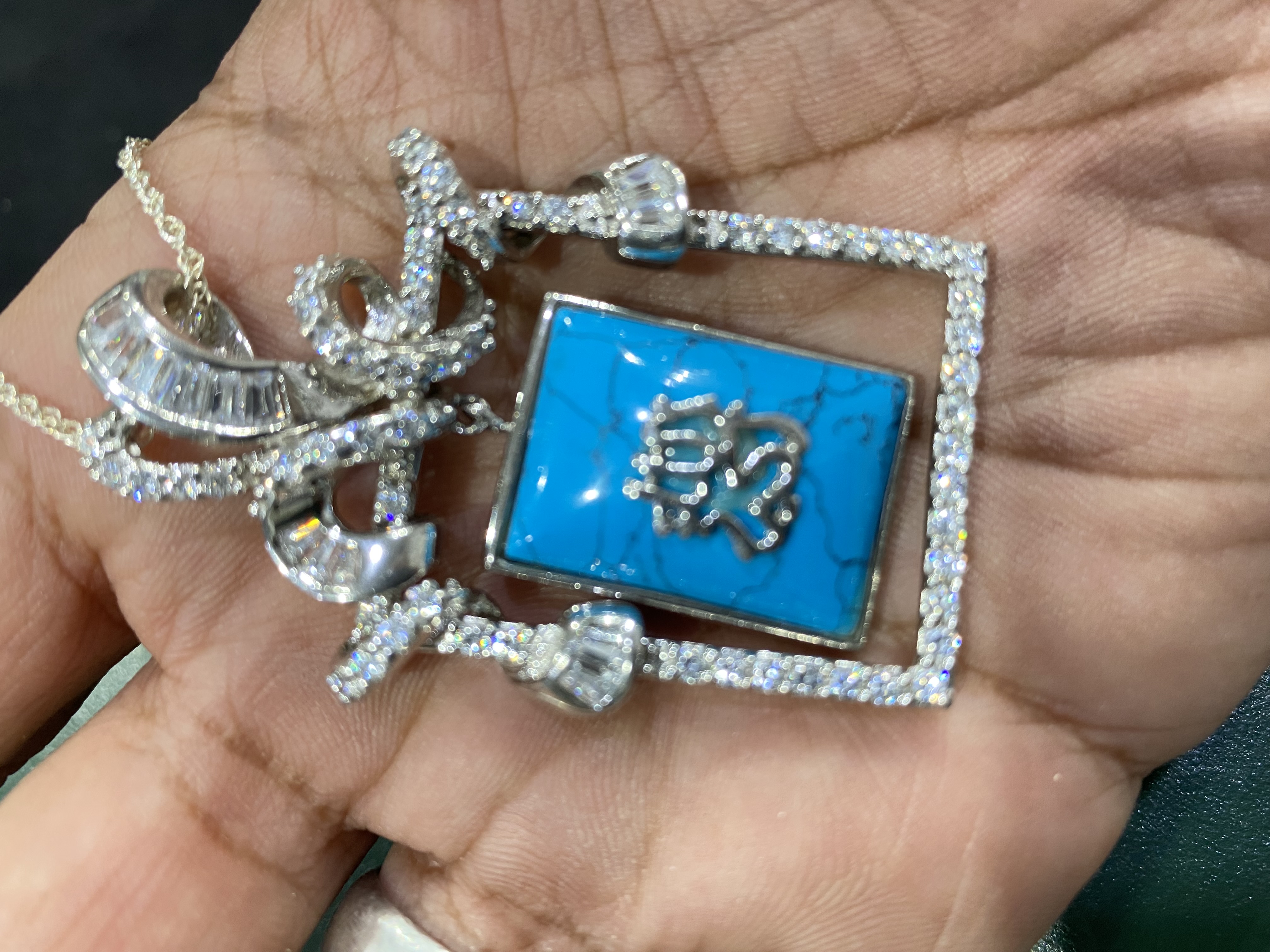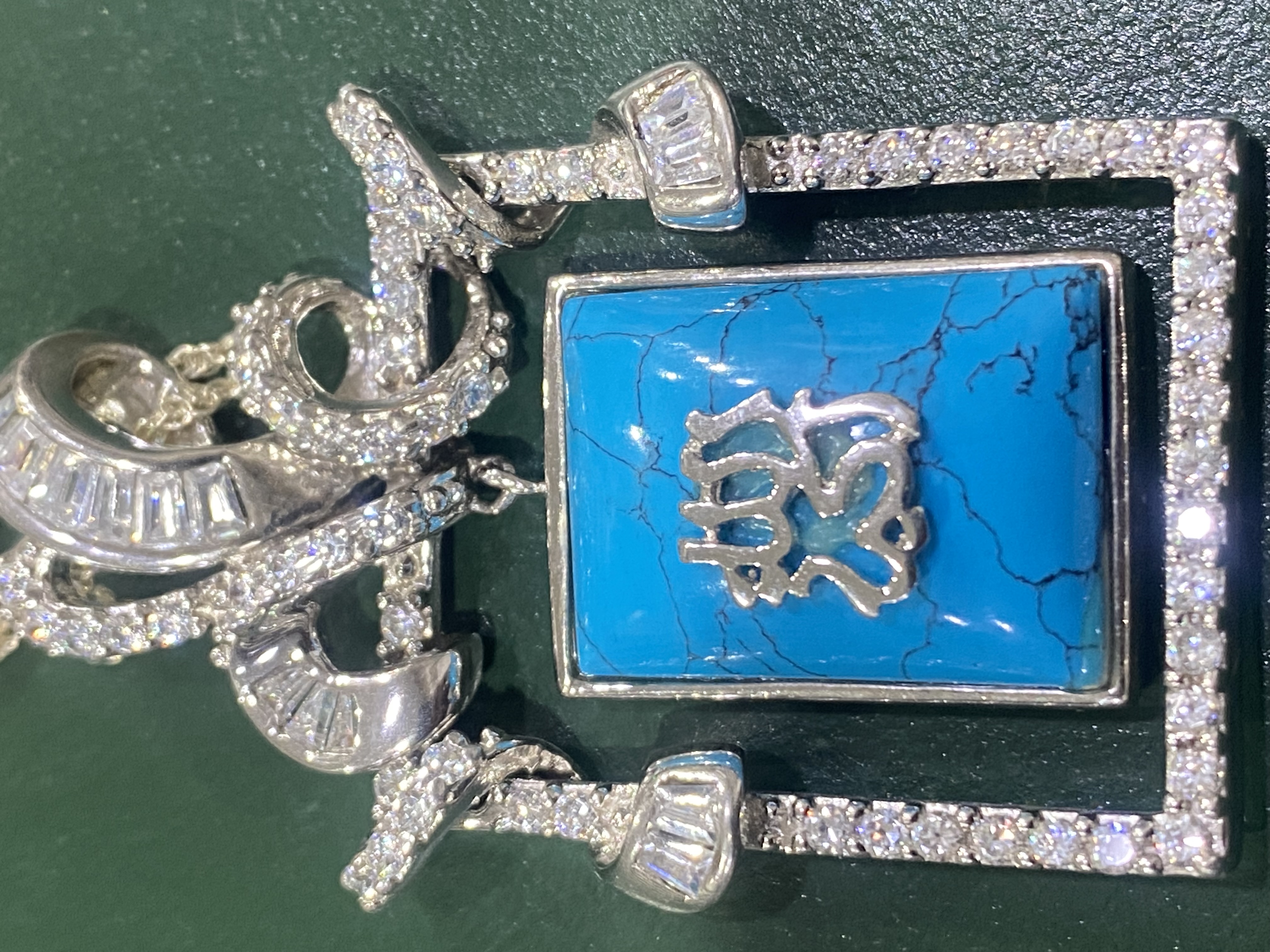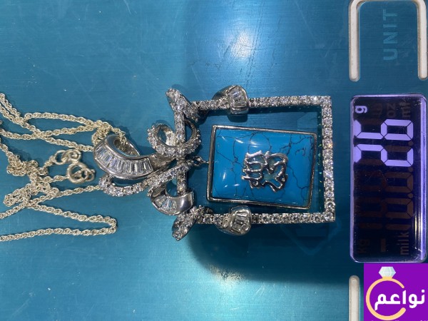 اقدم لكم تعليقة او قلادة وسلسلة فضة إيطالي بحجر فيروز طبيعي مربع ومرصعة بفصوص زركون درجة أولى - ومختومة بعيار 925 … قلادة مميزة لمحبي الاقتناء والتميز …وتنفع للإهداء ..قطعة نادرة … الوزن 26 جرام . السعر / 550 ريال نهائي . شحن وتوصيل مجاني لجميع مناطق المملكة .