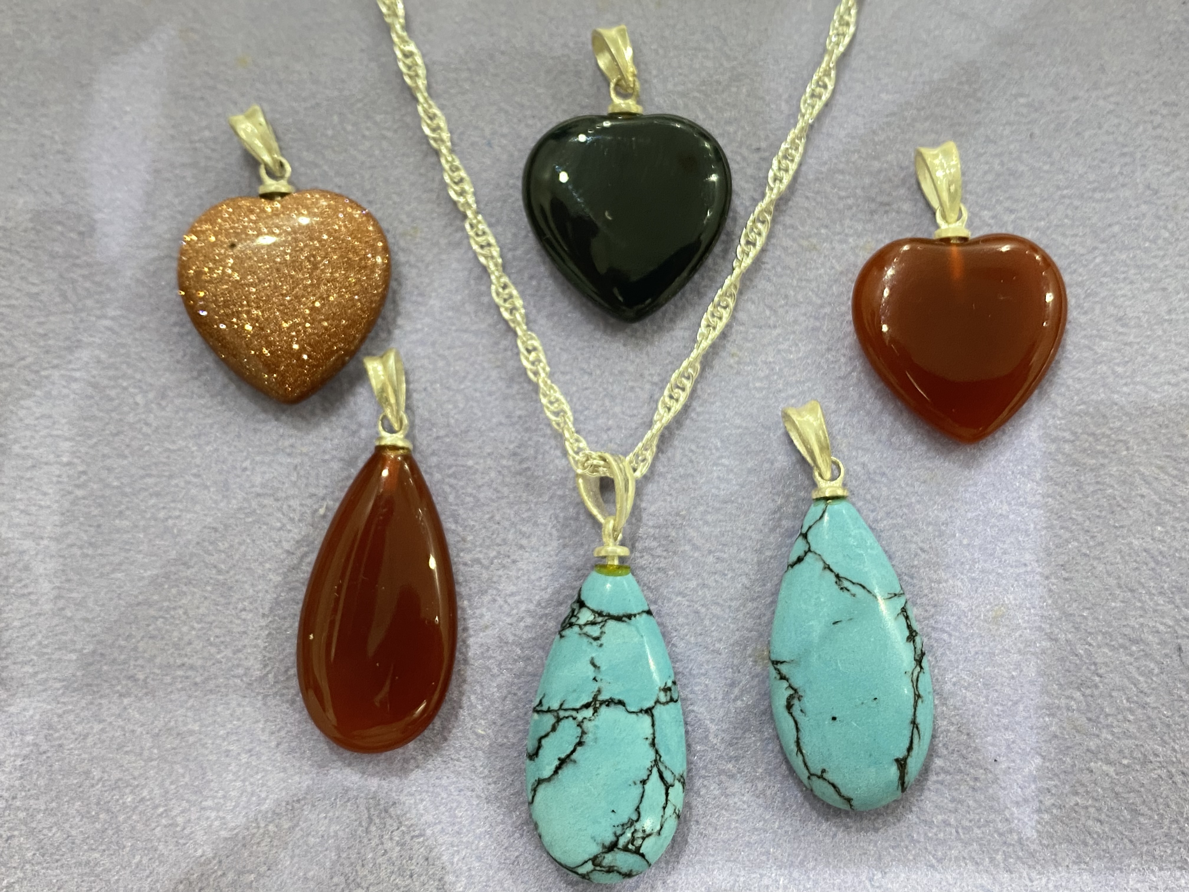اقدم لكم قلادات بأحجار الفيروز والعقيق الأحمر الكبدي والأسود بأشكال والوان مختلفة وبتعليق وسلسلة فضة عيار 925 إيطالي ناعمة وراقية لمحبي اقتناء الاحجار المميزة وبسعر ممتاز ومخفض ومنافس . سعر القلادة مع السلسلة / 130 ريال . شحن وتوصيل مجاني لجميع مناطق المملكة للباب .