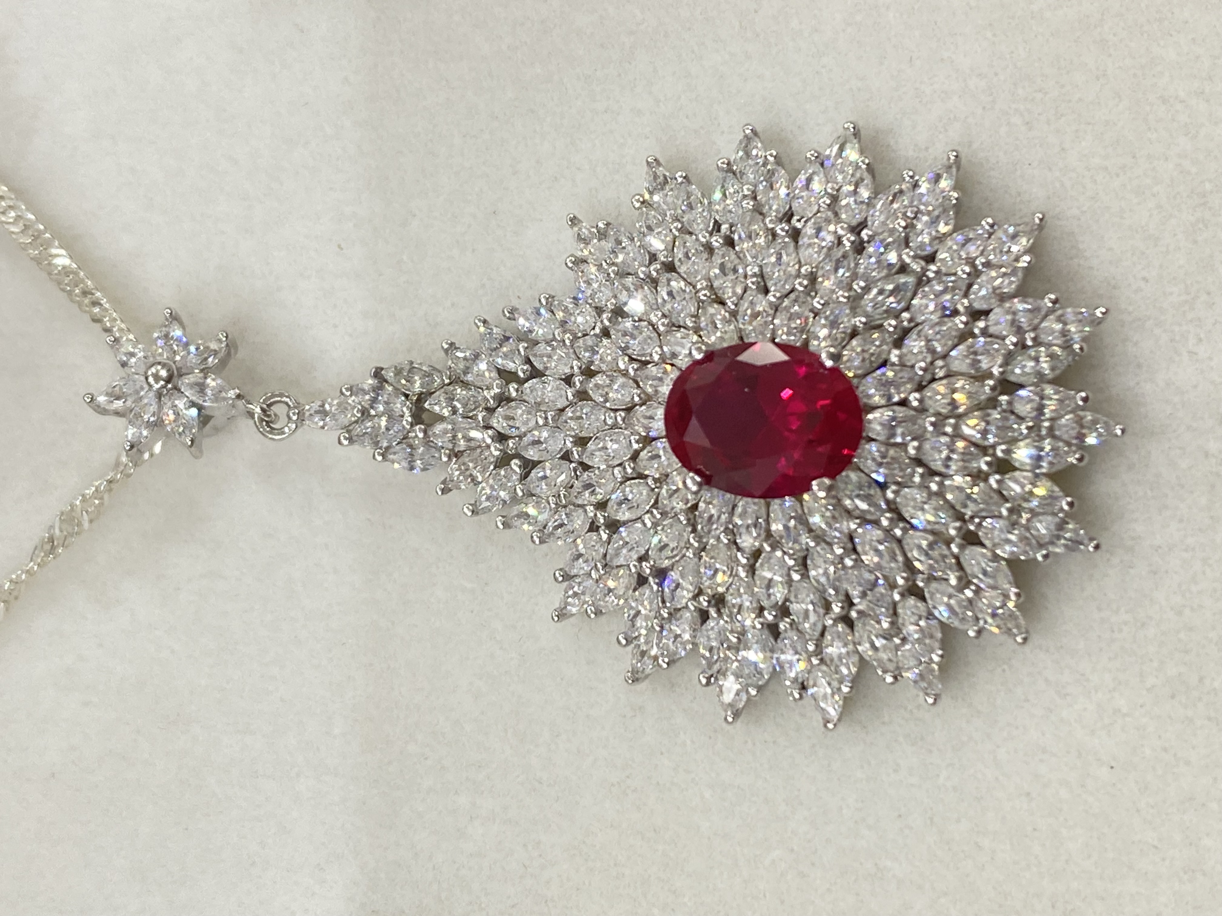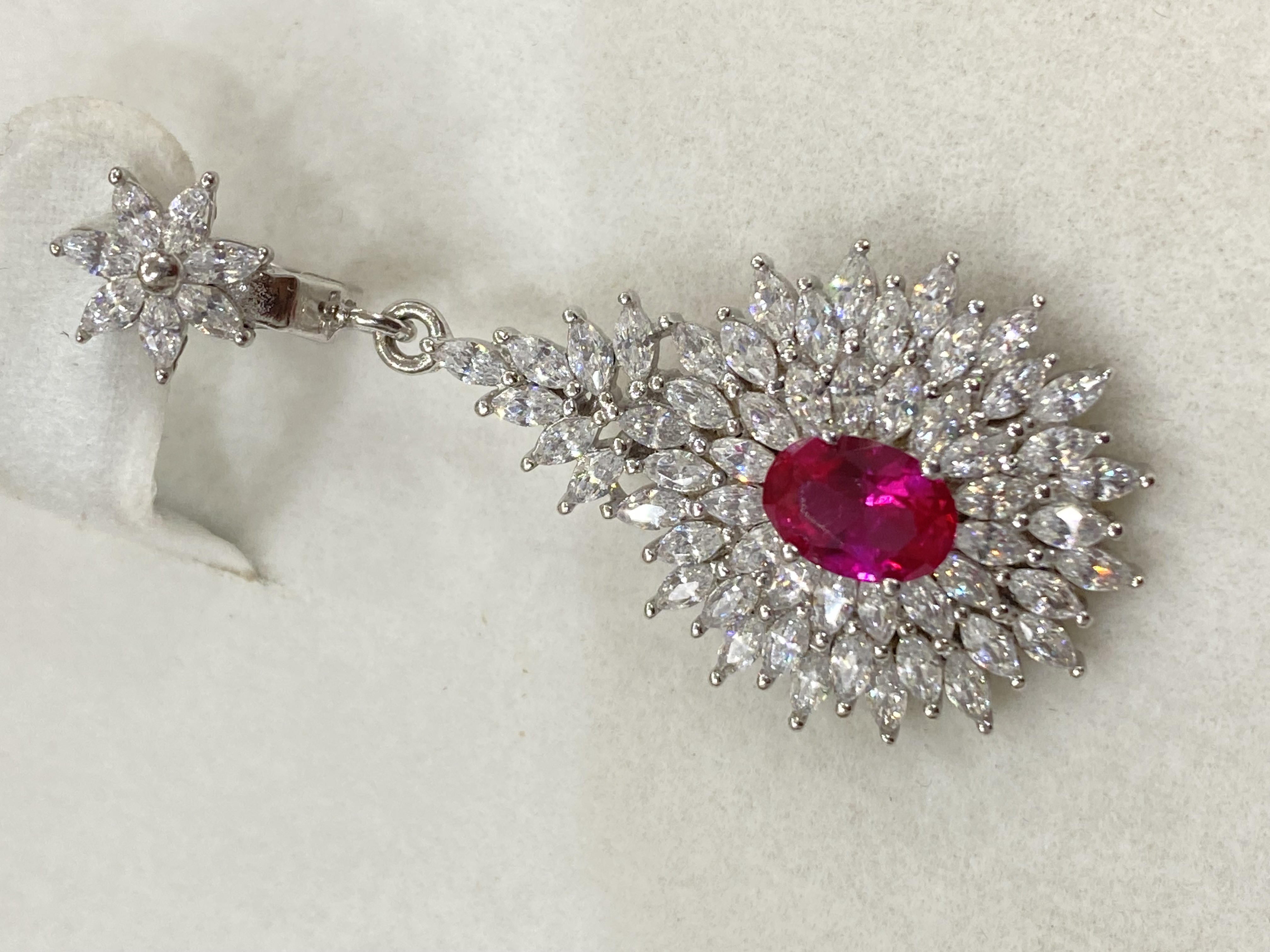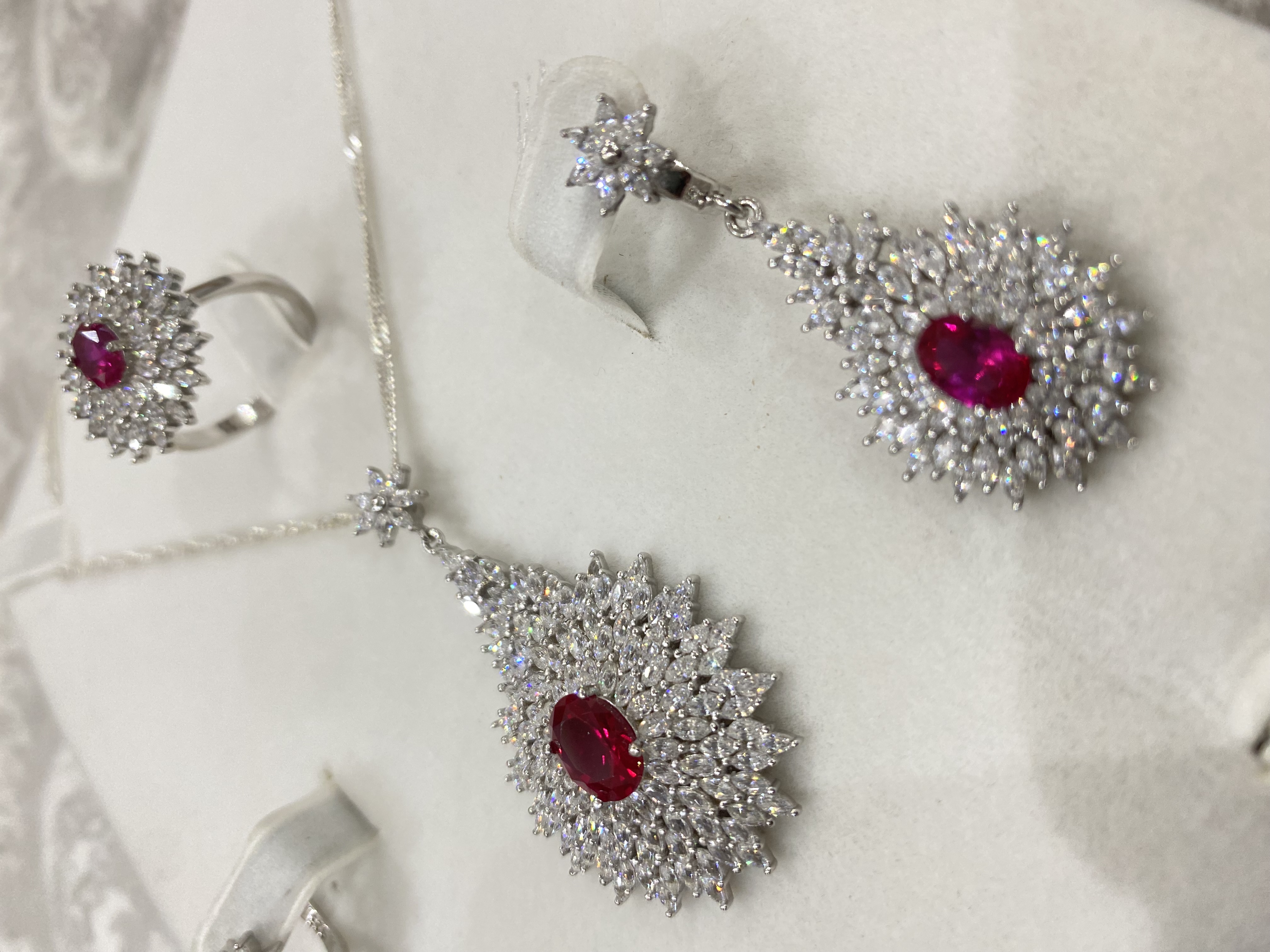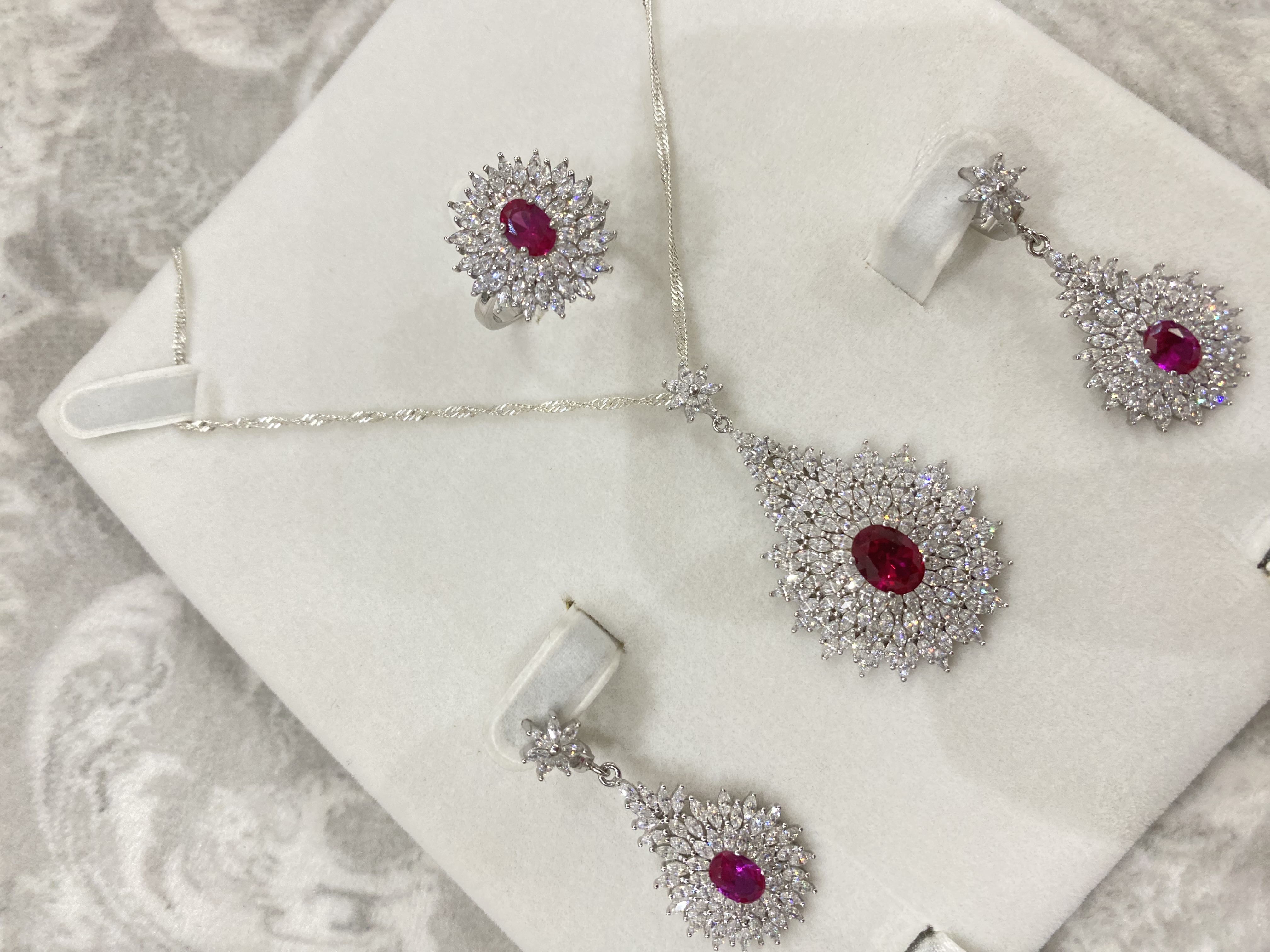 اقدم لكم طقم فضة إيطالي عيار 925 راقي وفخم ومميز بفصوص ياقوت أحمر ( روبي ) ومرصع بفصوص زركون فاخر شبيه الالماس في لمعته وبريقه - لمحبي الأناقة والفخامة والتميز . يتكون من / سلسلة وتعليقة وحلق وخاتم + بوكس طقم جميل الوزن / 31 جرام . السعر / 658 ريال نهائي شامل الشحن والتوصيل لجميع مناطق المملكة للباب .