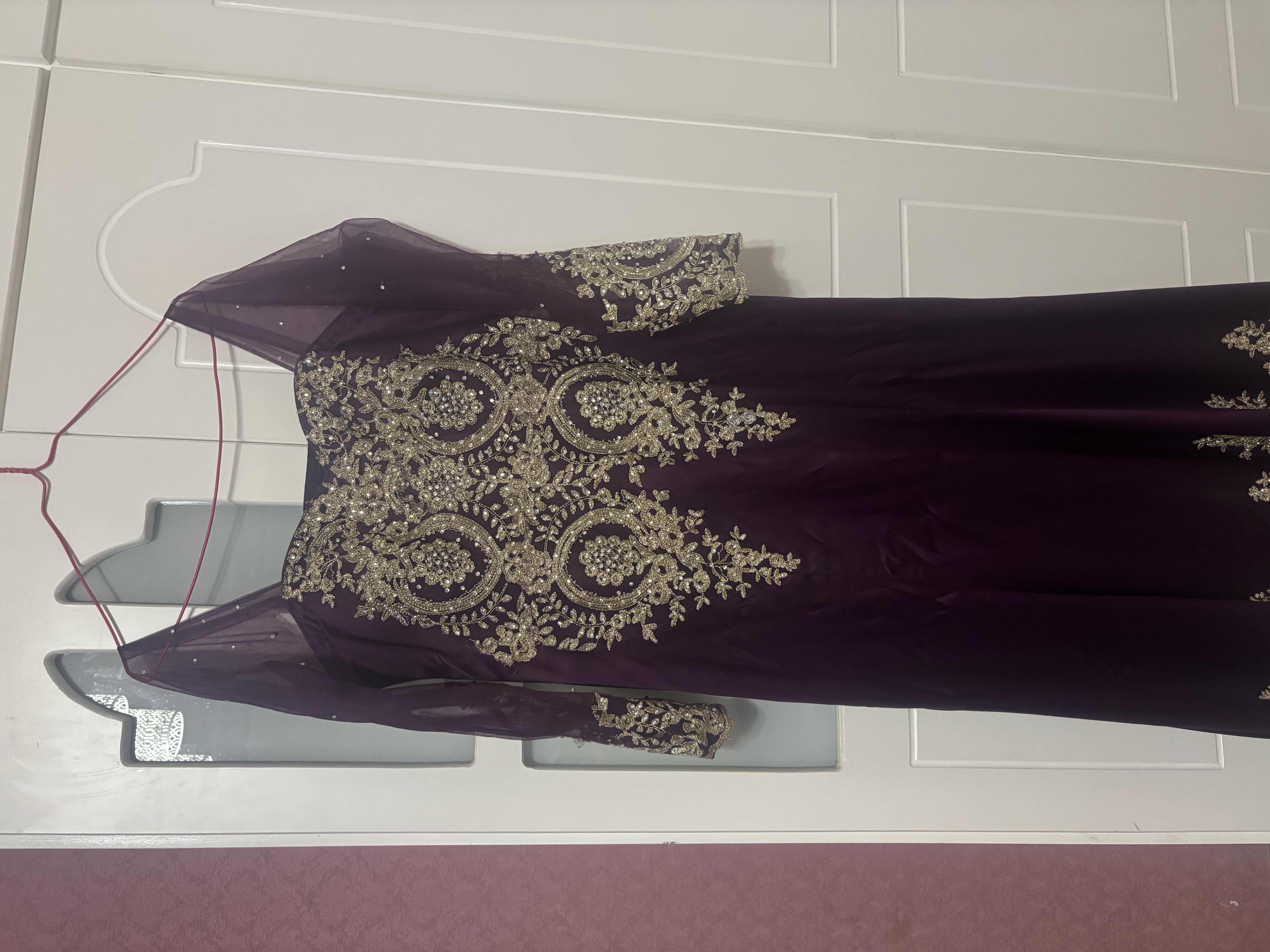 فستان مناسبات لونه موف غامق ، يلبس مقاس L و XL مع تطريز فضي لم يلبس سوى مره واحده فقط ..