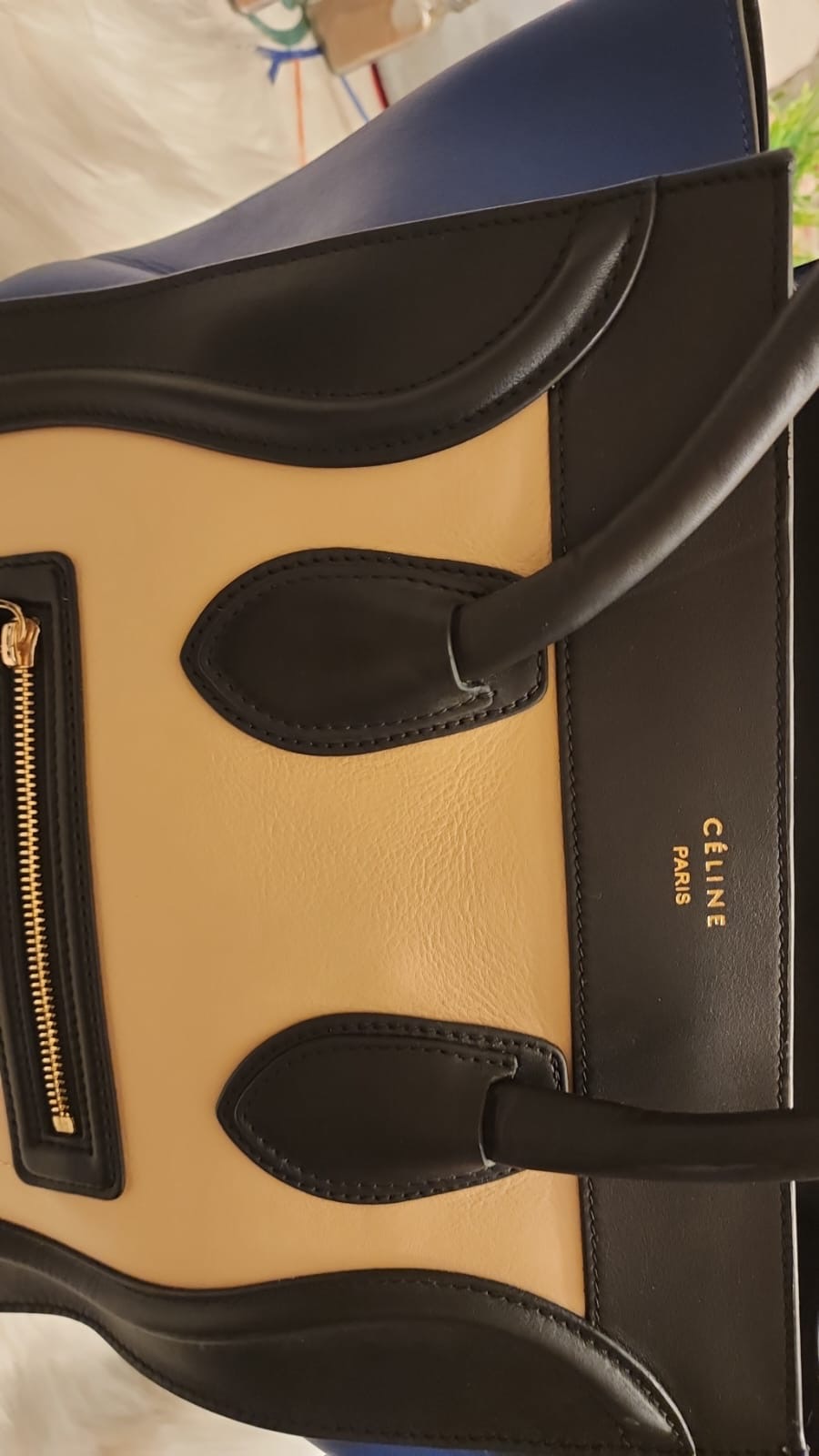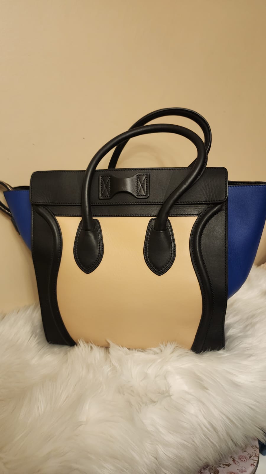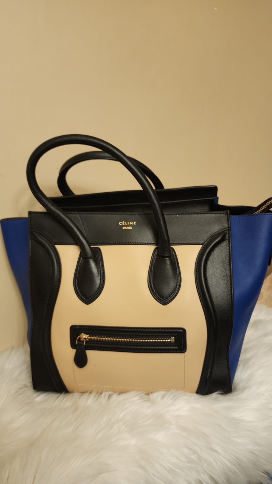 الحاله : نظيفه جداً البراند او المصمم:سيلين المادة المصنعه:جلد الحجم - المقاس:ميديوم اللون: موضح في الصورة الوصف "حقيبة أمتعة صغيرة" من سيلين ثلاثية الألوان من مجموعة فيبي فيلو. نمط Colorblock مع ظلال من اللون البيج والأسود والأزرق. أجزاء صلبة ذهبية اللون. الجزء الخارجي من جلد العجل الناعم. جوانب من الجلد السويدي قابلة للتوسيع. جيب خارجي واحد بسحاب في الأمام. الجزء الداخلي من الجلد مع جيب واحد بسحاب وجيبين منزلقين. تُغلق حقيبة اليد بسحاب إغلاق في الأعلى. المادة الخارجية: جلد العجل، جلد الغزال الداخلي: جلد العجلالقياسات (سم)