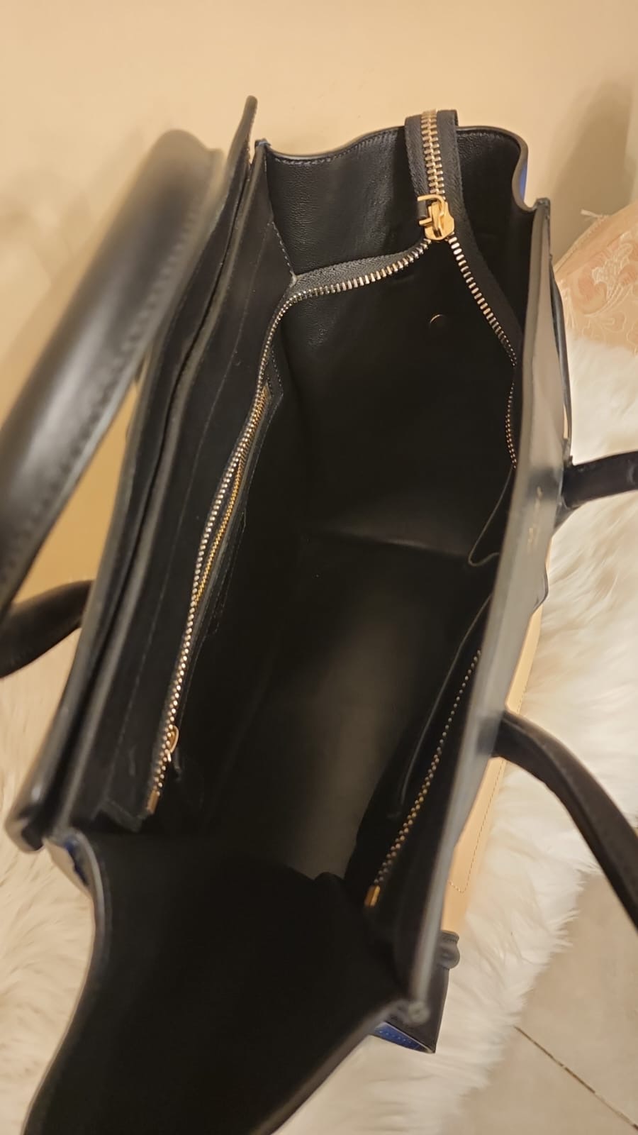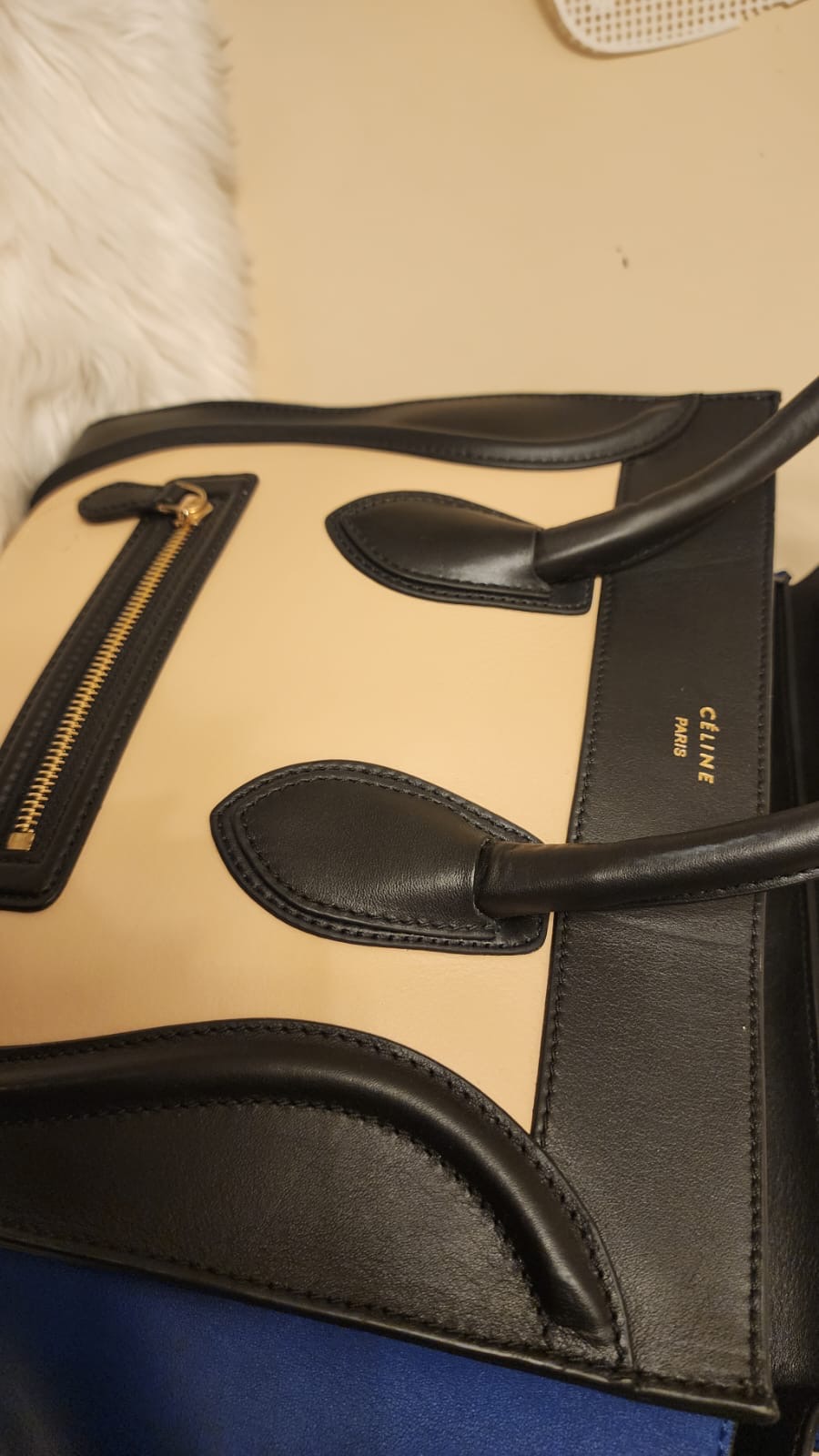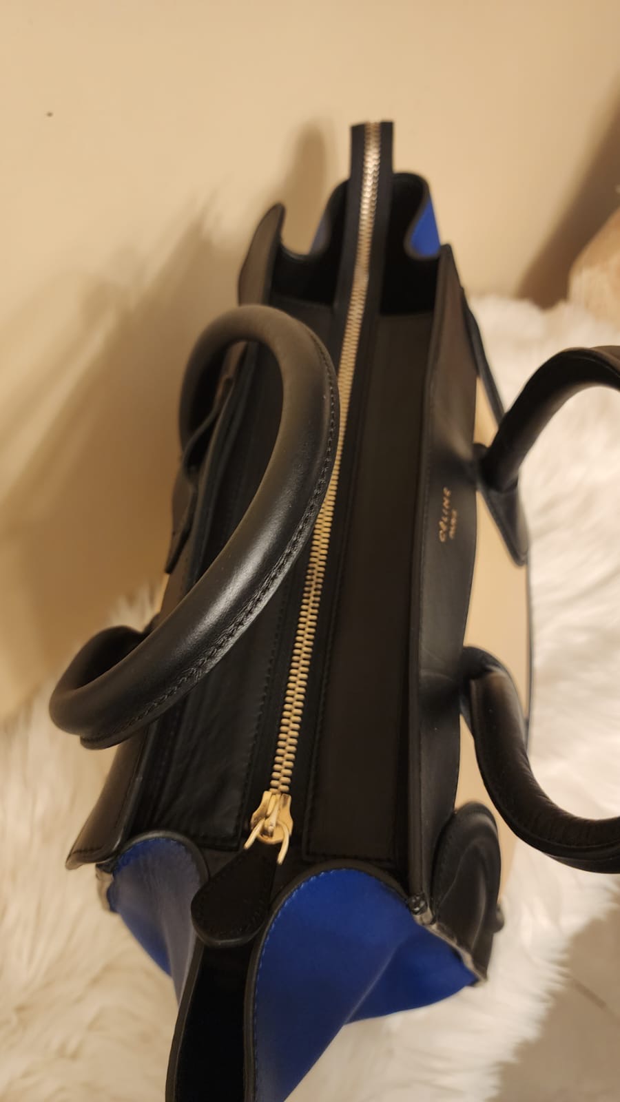 الحاله : نظيفه جداً البراند او المصمم:سيلين المادة المصنعه:جلد الحجم - المقاس:ميديوم اللون: موضح في الصورة الوصف "حقيبة أمتعة صغيرة" من سيلين ثلاثية الألوان من مجموعة فيبي فيلو. نمط Colorblock مع ظلال من اللون البيج والأسود والأزرق. أجزاء صلبة ذهبية اللون. الجزء الخارجي من جلد العجل الناعم. جوانب من الجلد السويدي قابلة للتوسيع. جيب خارجي واحد بسحاب في الأمام. الجزء الداخلي من الجلد مع جيب واحد بسحاب وجيبين منزلقين. تُغلق حقيبة اليد بسحاب إغلاق في الأعلى. المادة الخارجية: جلد العجل، جلد الغزال الداخلي: جلد العجلالقياسات (سم)