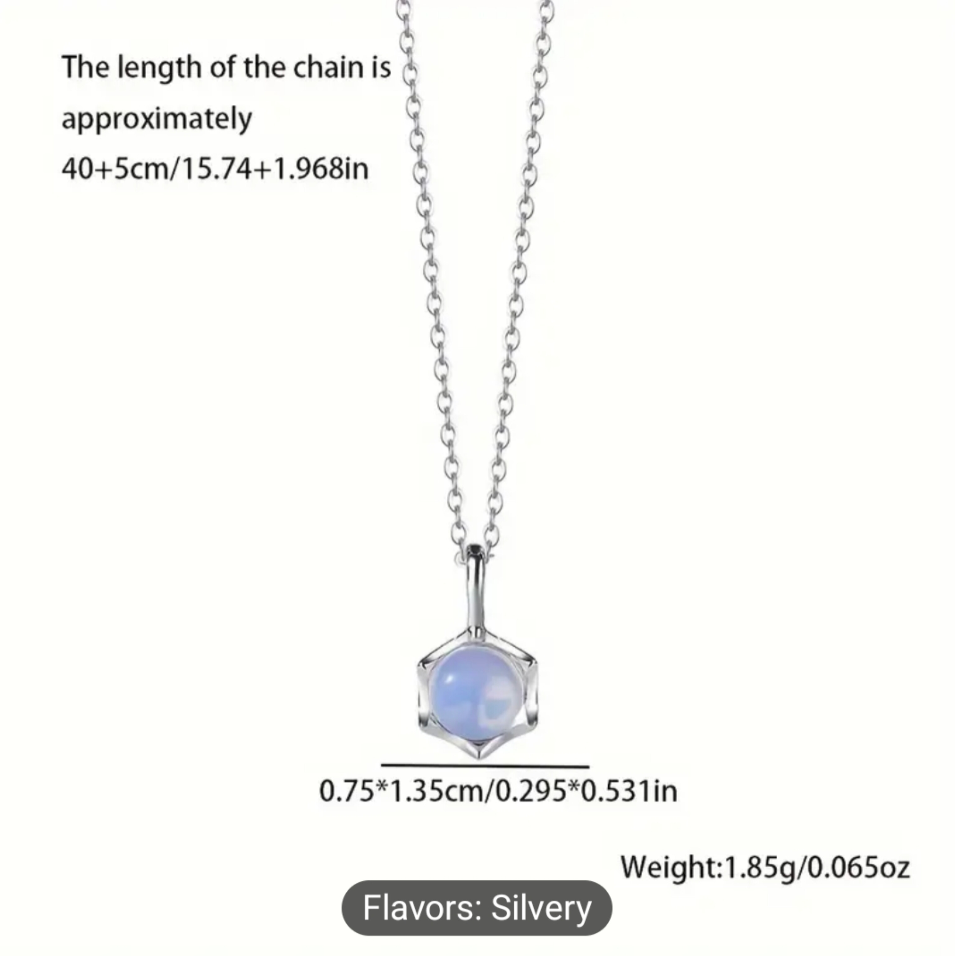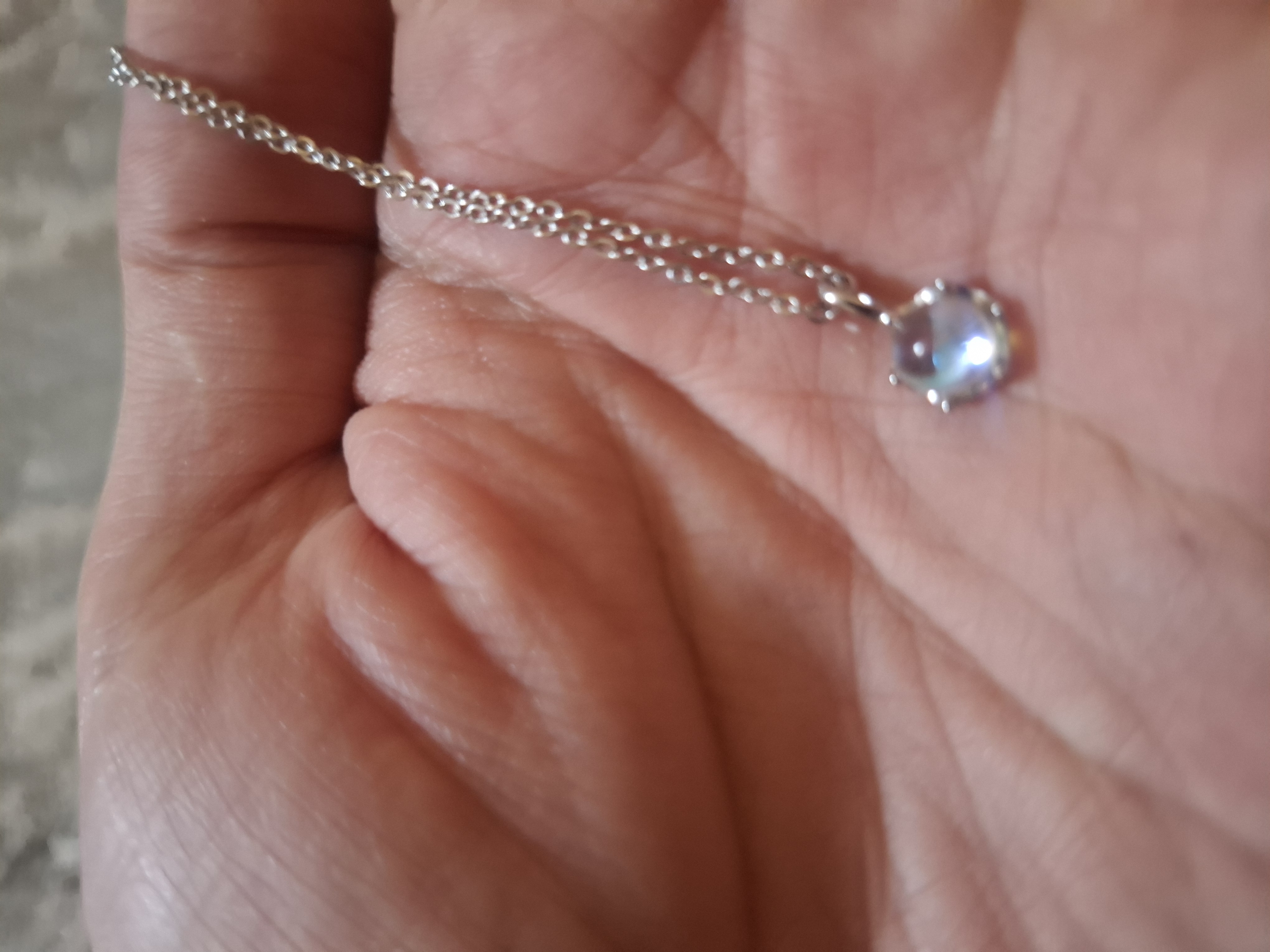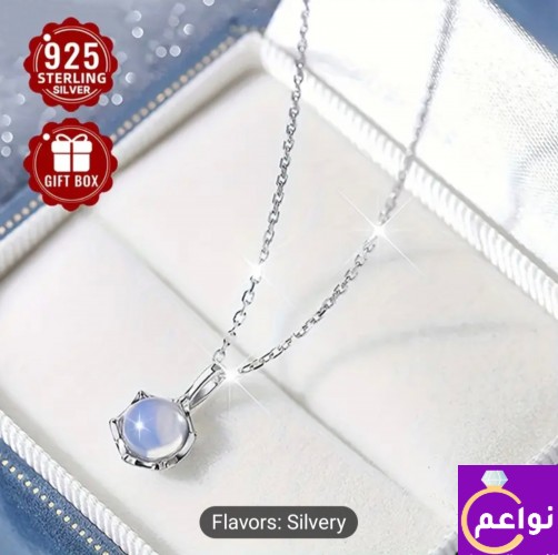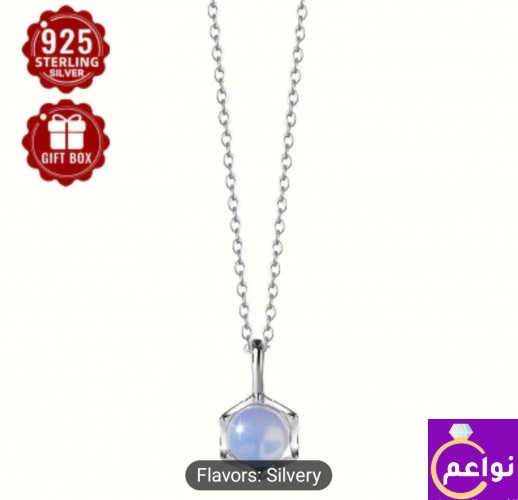 سلسلة فضة استرلينى 925 بفص من حجر القمر الازرق حجر القمر (بالإنجليزية: Moonstone) هو حجر كريم، وهو أحد أنواع الفلسبار، وتركيبه الكيميائي يتكون من سيليكات الألومنيوم وعنصر البوتاسيوم، وهو ذو لمعان لؤلؤى، يعزى إلى تداخل الضوء المنعكس على شوائب دقيقة من معدن الألبيت بداخله. وبرغم رخاوته ووضوح تشققه فهو يعتبر من الأحجار الكريمة بالنسبة إلى لمعانه اللؤلؤى، وموطنه سريلانكا وميانمار ومدغشقر وسويسرا. تصلح للبنات الصغيرات يزن 1.85 جم