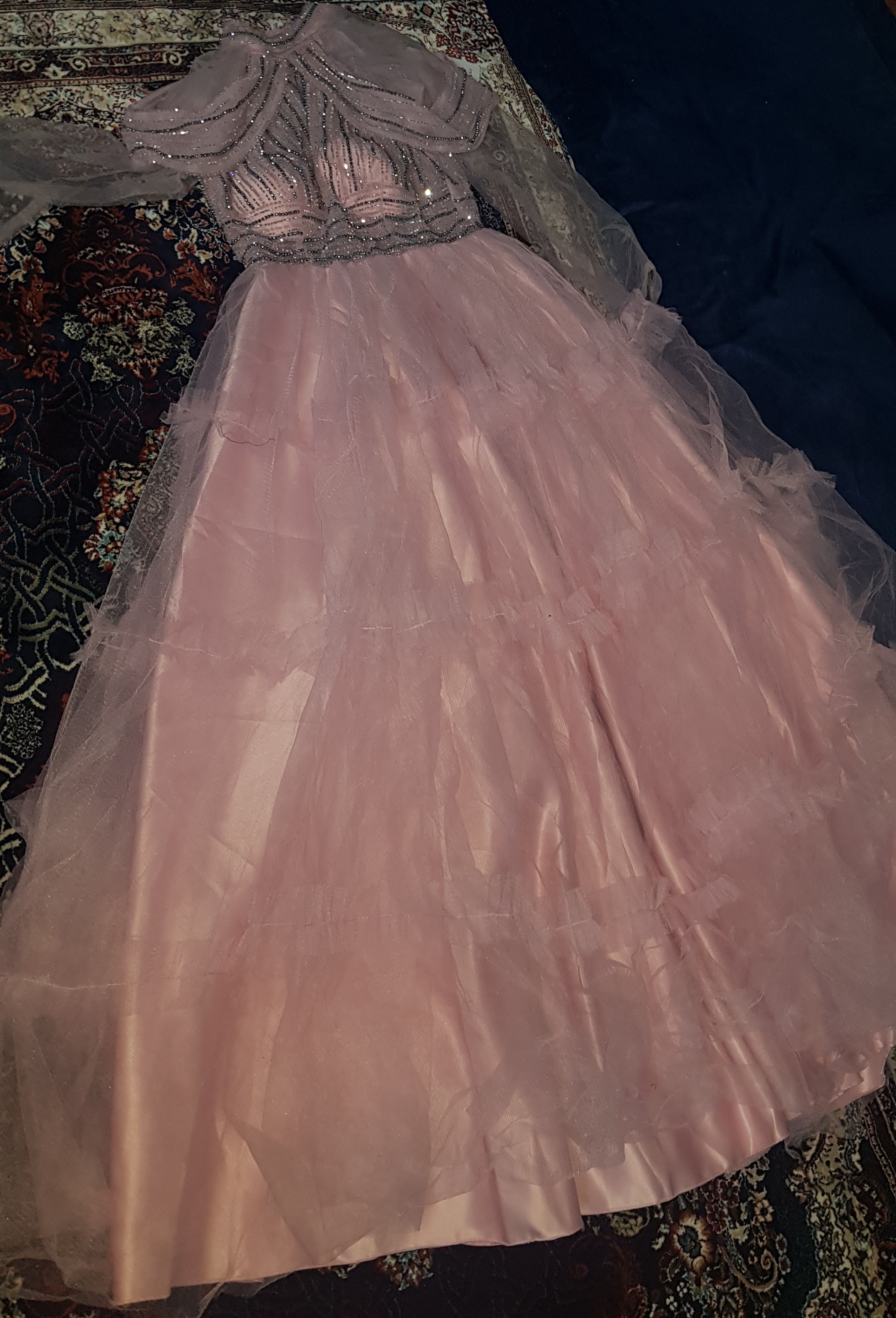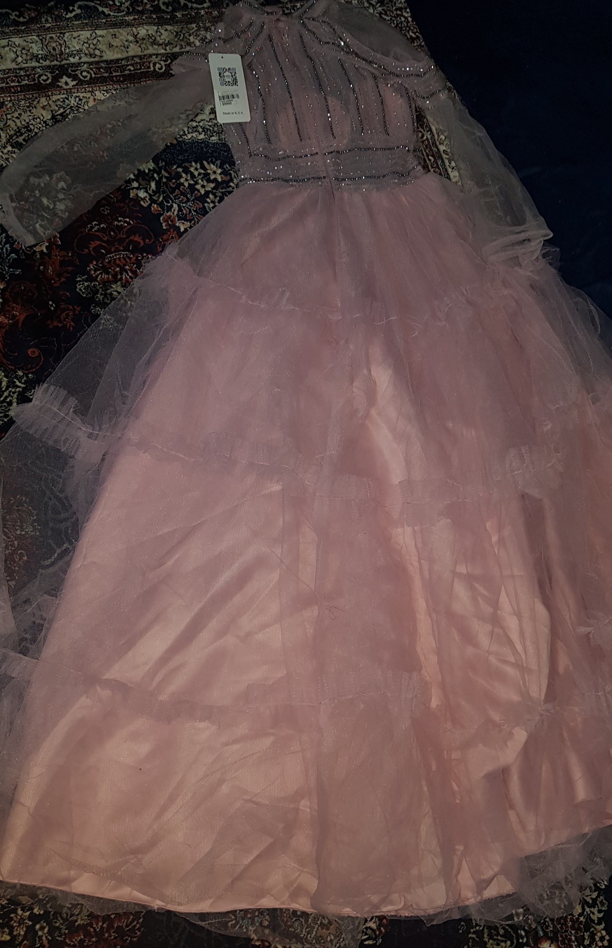 الفستان نفس الصوره والتصوير بكاميرة الجوال جديد وردي فاتح ومقاسه رقم 8 يعني m ابا فيه 500 ريال