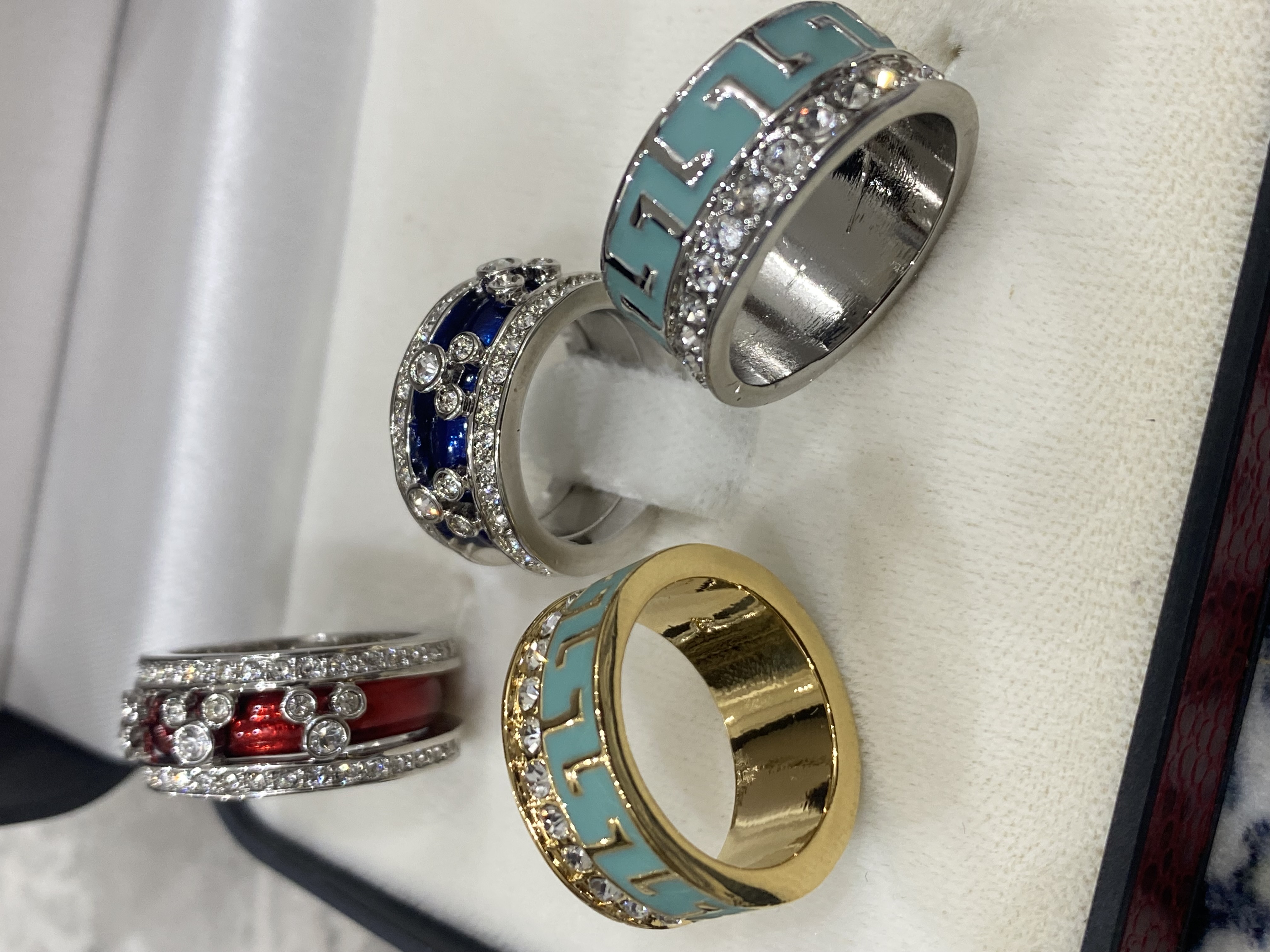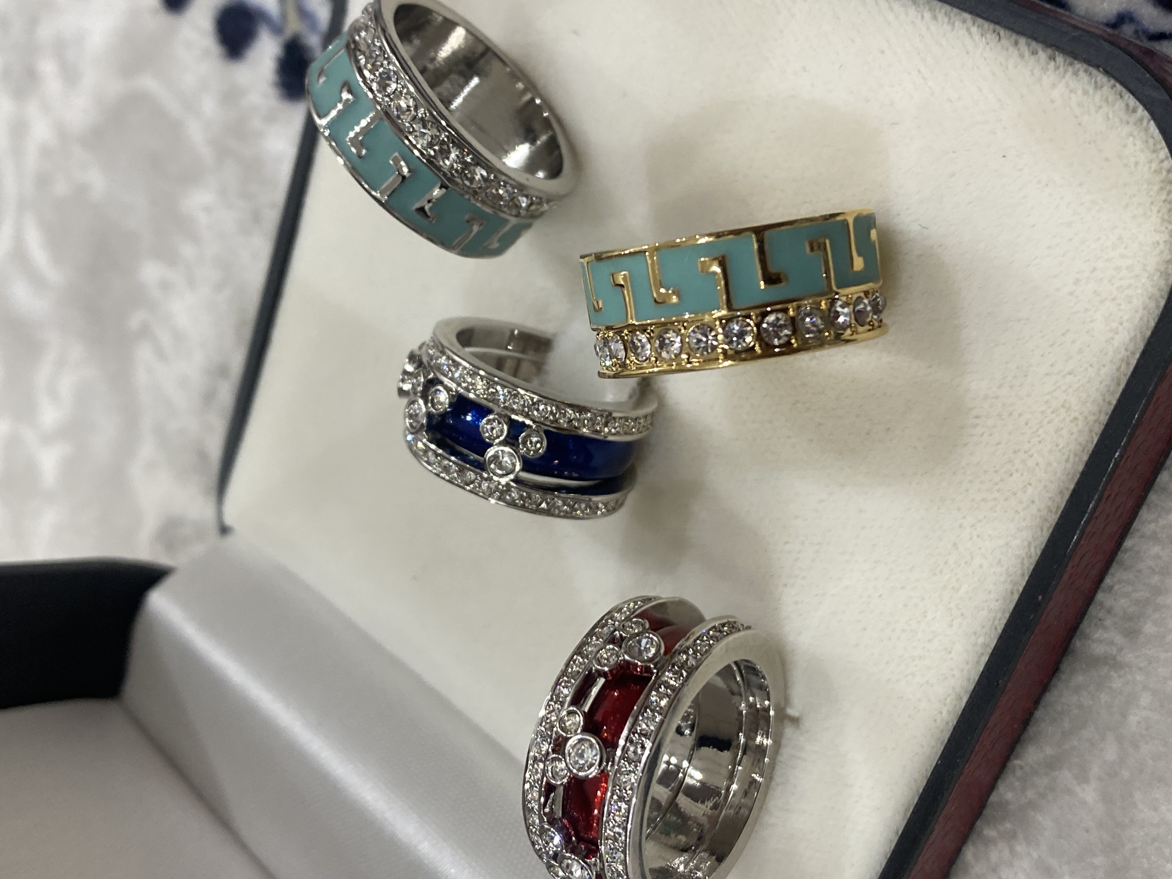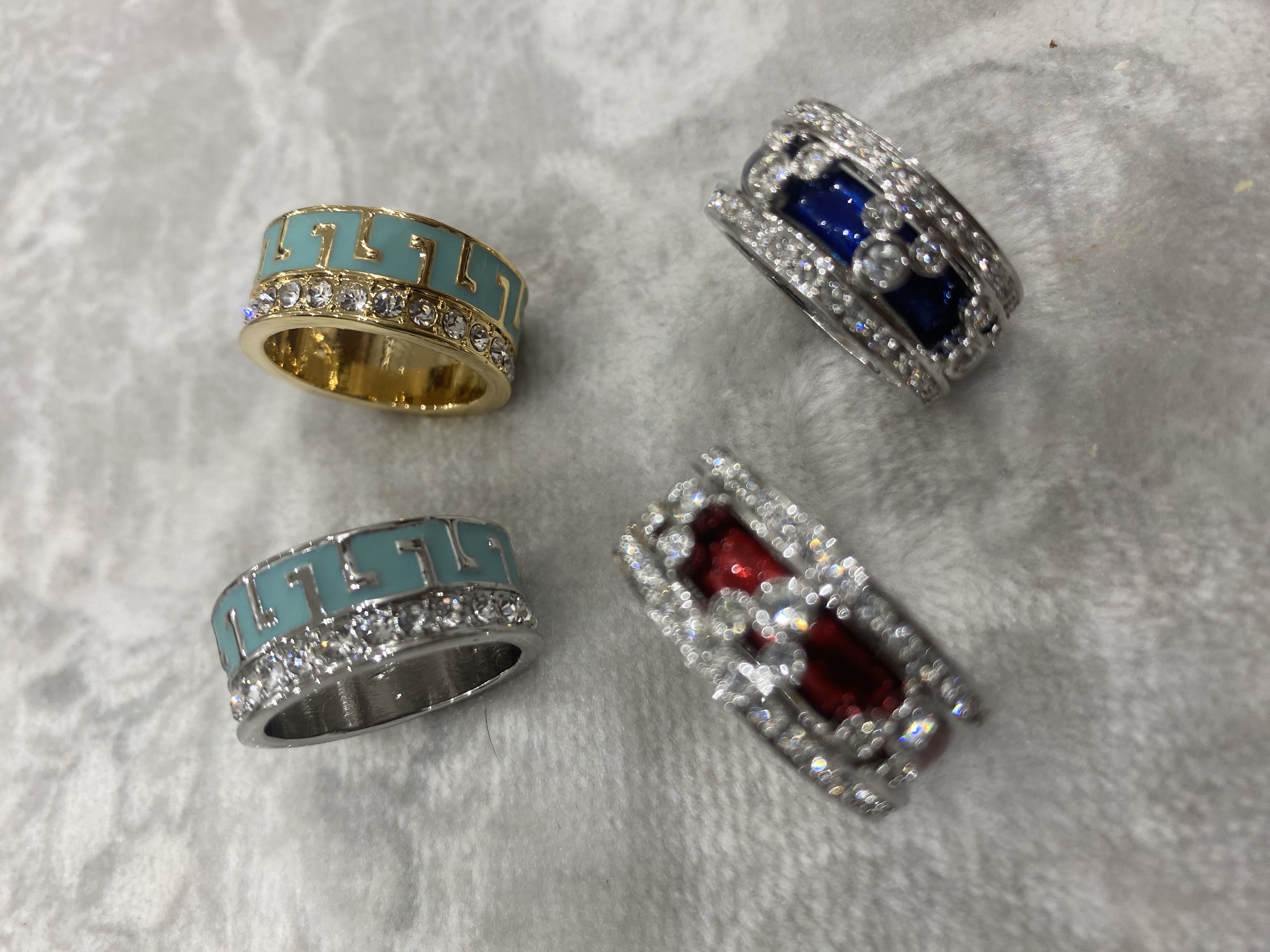 خواتم ودبل نسائية راقية وفاخرة عريضة وجديدة بألوان وموديلات مختلفة فضي وذهبي ومرصعة بفصوص زركون أمريكي وبجميع المقاسات / 5/6/7/8/9/10/11 سعر الدبلة الواحدة / 30 ريال . سعر الدرزن 12 دبلة / 240 ريال . شحن وتوصيل لجميع مناطق المملكة للباب / 38 ريال .