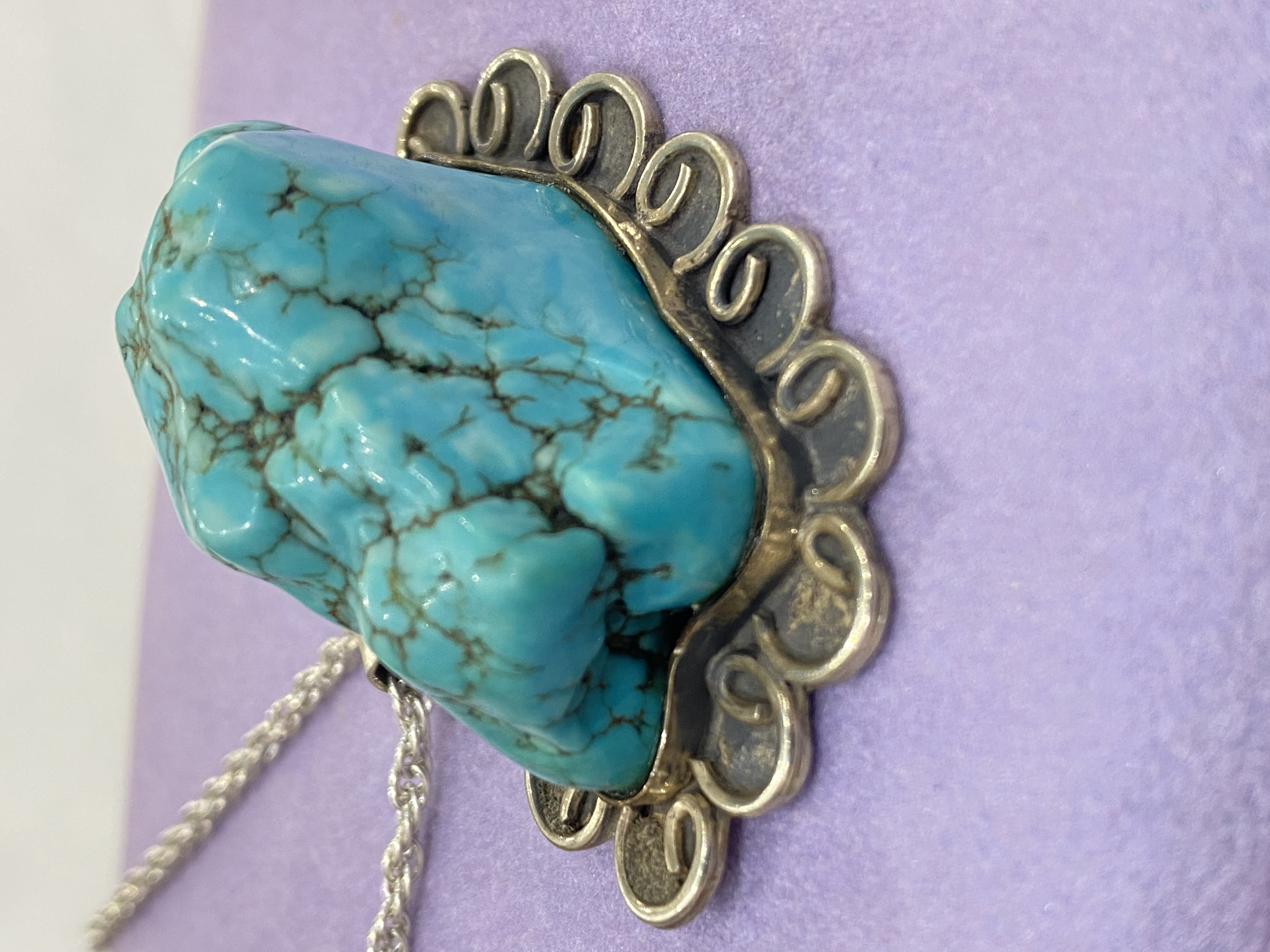 اقدم لكم قلادة نادرة وقديمة من حجر الفيروز الطبيعي بتعليقة تفصيل وسلسلة فضه إيطالي عيار 925 - لمحبي الاحجار الكريمة النادرة والمميزة - بحجم راهي - الوزن / 46 جرام . وتعتبر من الأنتيك والقطع القديمة النادرة .. السعر / 950 ريال نهائي شامل الشحن والتوصيل لجميع مناطق المملكة .