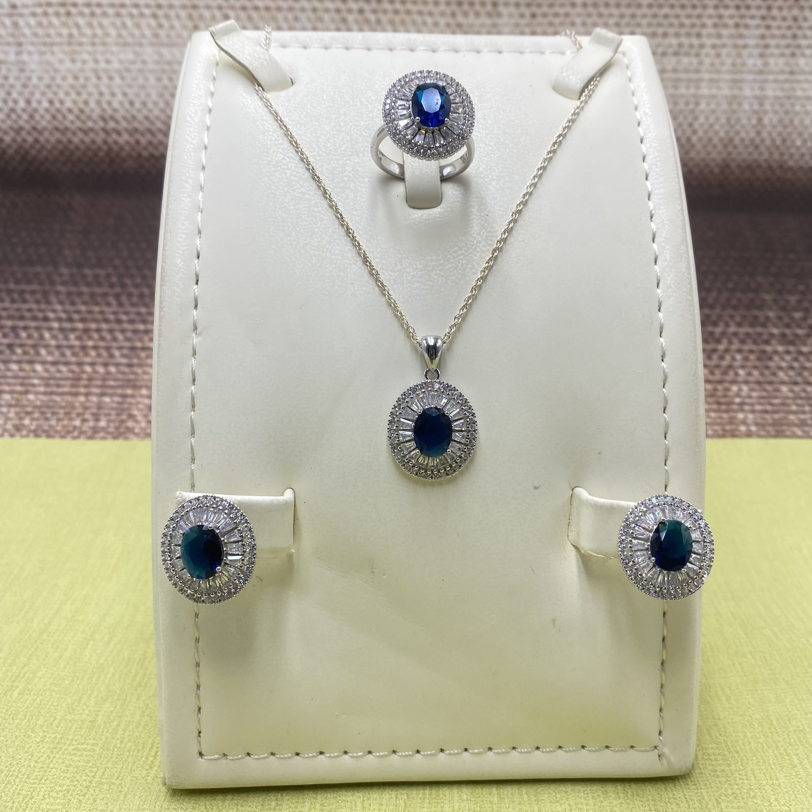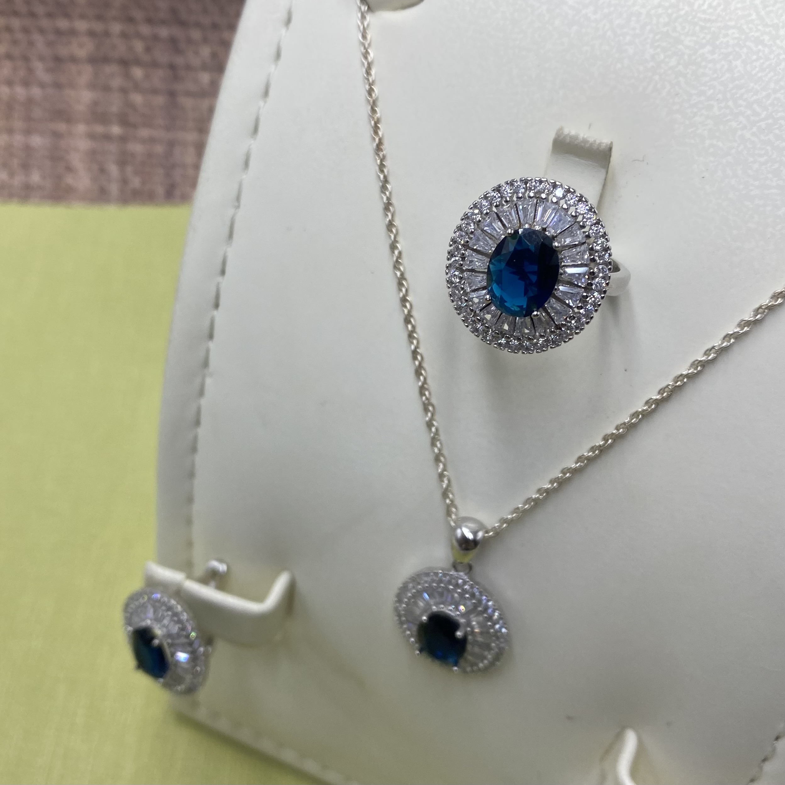 اقدم لكم طقم من الفضة الإسترليني - عيار 925 - بأحجار الياقوت الازرق ( زفير ) المعالج والمرصع بفصوص زركون مميز مكون من ( سلسلة و تعليقة و حلق و خاتم ) . أناقة - جمال - تميز …. السعر / 444 ريال نهائي شامل الشحن والتوصيل .