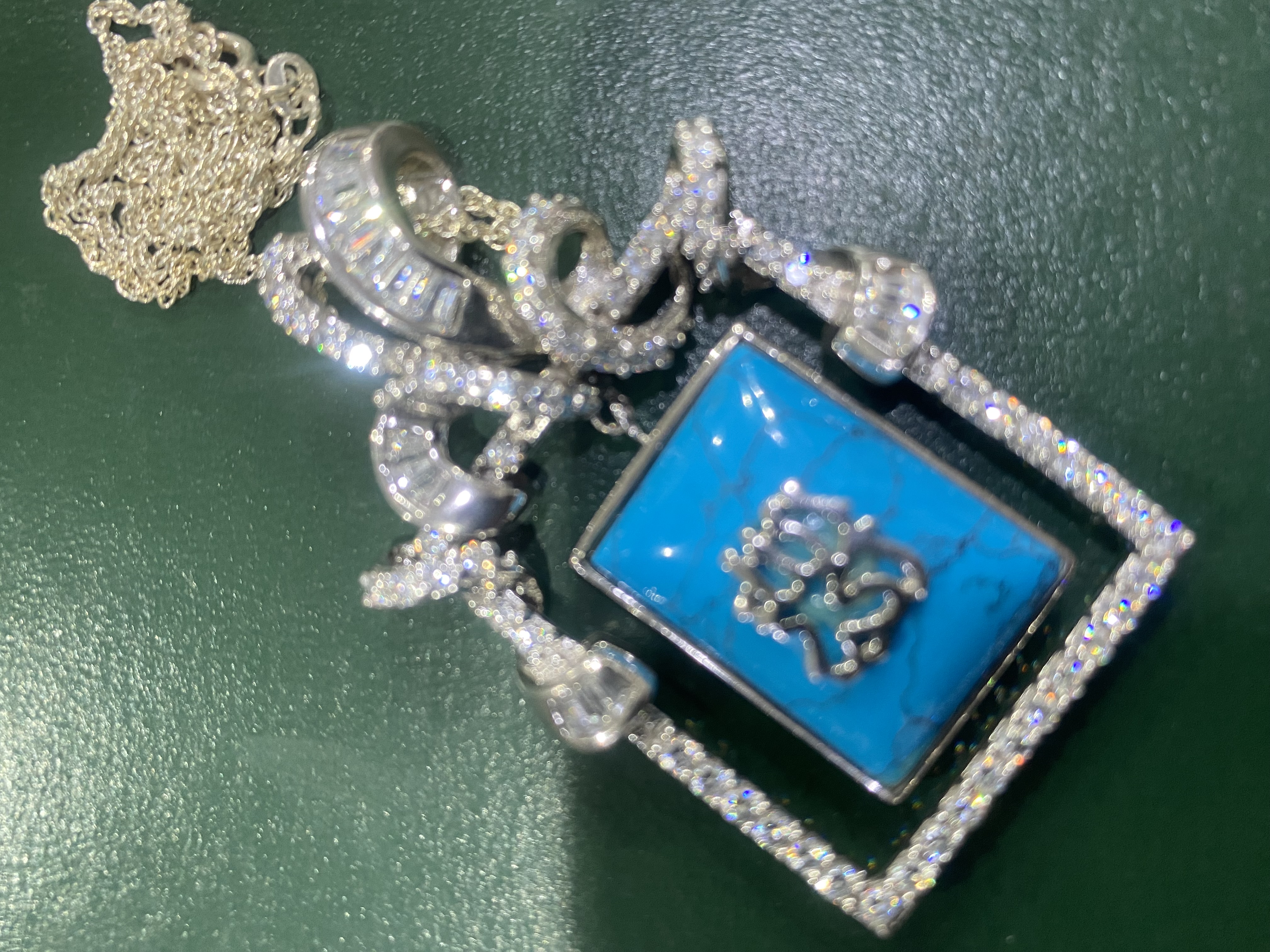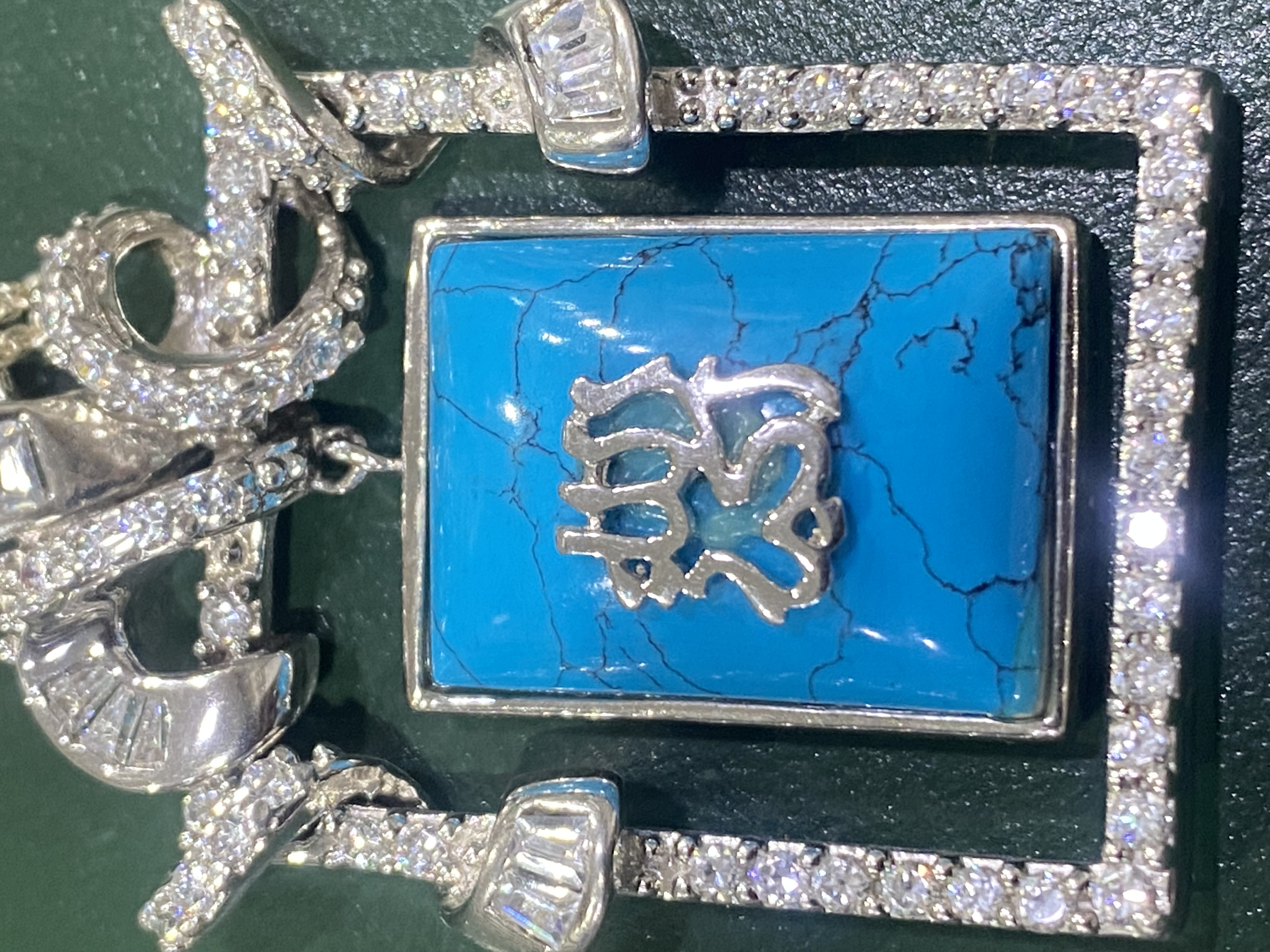 اقدم لكم تعليقة او قلادة وسلسلة فضة إيطالي بحجر فيروز طبيعي مربع ومرصعة بفصوص زركون درجة أولى - ومختومة بعيار 925 … قلادة مميزة لمحبي الاقتناء والتميز …وتنفع للإهداء ..قطعة نادرة … الوزن 26 جرام . السعر / 550 ريال نهائي . شحن وتوصيل مجاني لجميع مناطق المملكة .