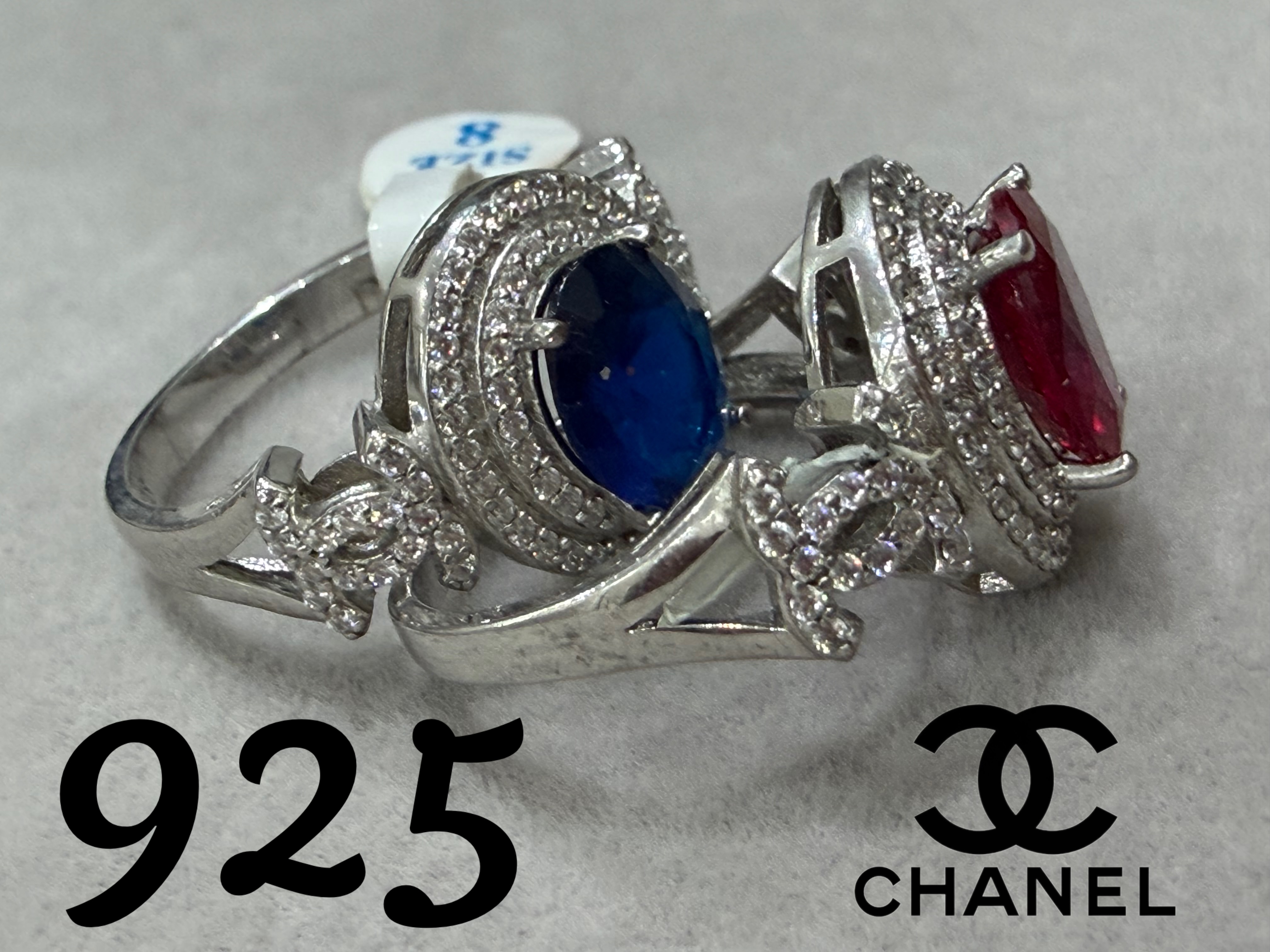 اقدم لكم خواتم فضة نسائية راقية ( شانيل CHANEL ) عيار 925 - إيطالي - بفصوص ياقوت أزرق وأحمر صناعي ومرصعة بفصوص زركون أبيض فاخر - خواتم جديدة ومميزة وراقية - بعدة مقاسات مختلفة . سعر الخاتم / 125 ريال نهائي . شحن وتوصيل مجاني لجميع مناطق المملكة للباب .
