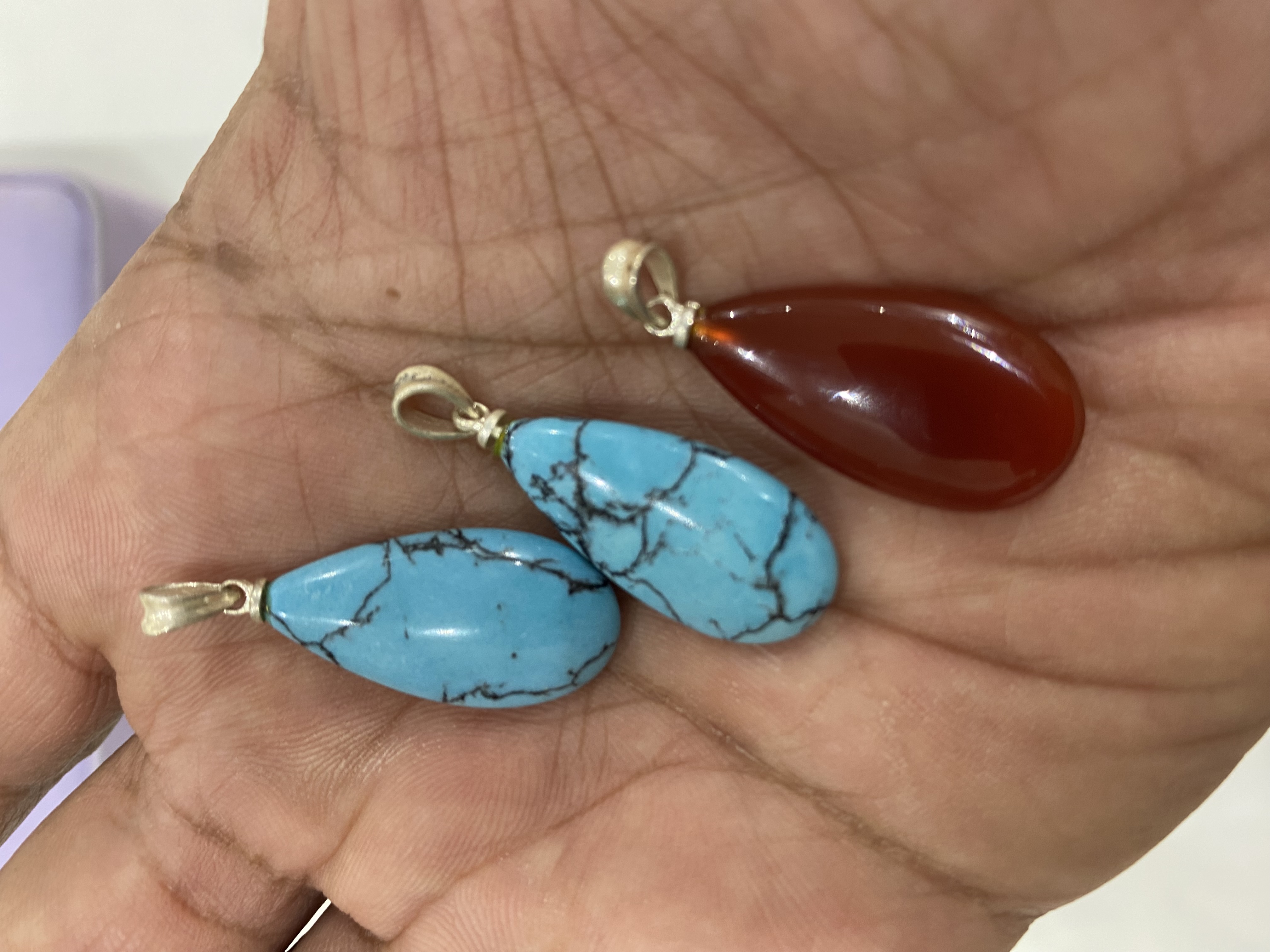 اقدم لكم قلادات بأحجار الفيروز والعقيق الأحمر الكبدي والأسود بأشكال والوان مختلفة وبتعليق وسلسلة فضة عيار 925 إيطالي ناعمة وراقية لمحبي اقتناء الاحجار المميزة وبسعر ممتاز ومخفض ومنافس . سعر القلادة مع السلسلة / 130 ريال . شحن وتوصيل مجاني لجميع مناطق المملكة للباب .