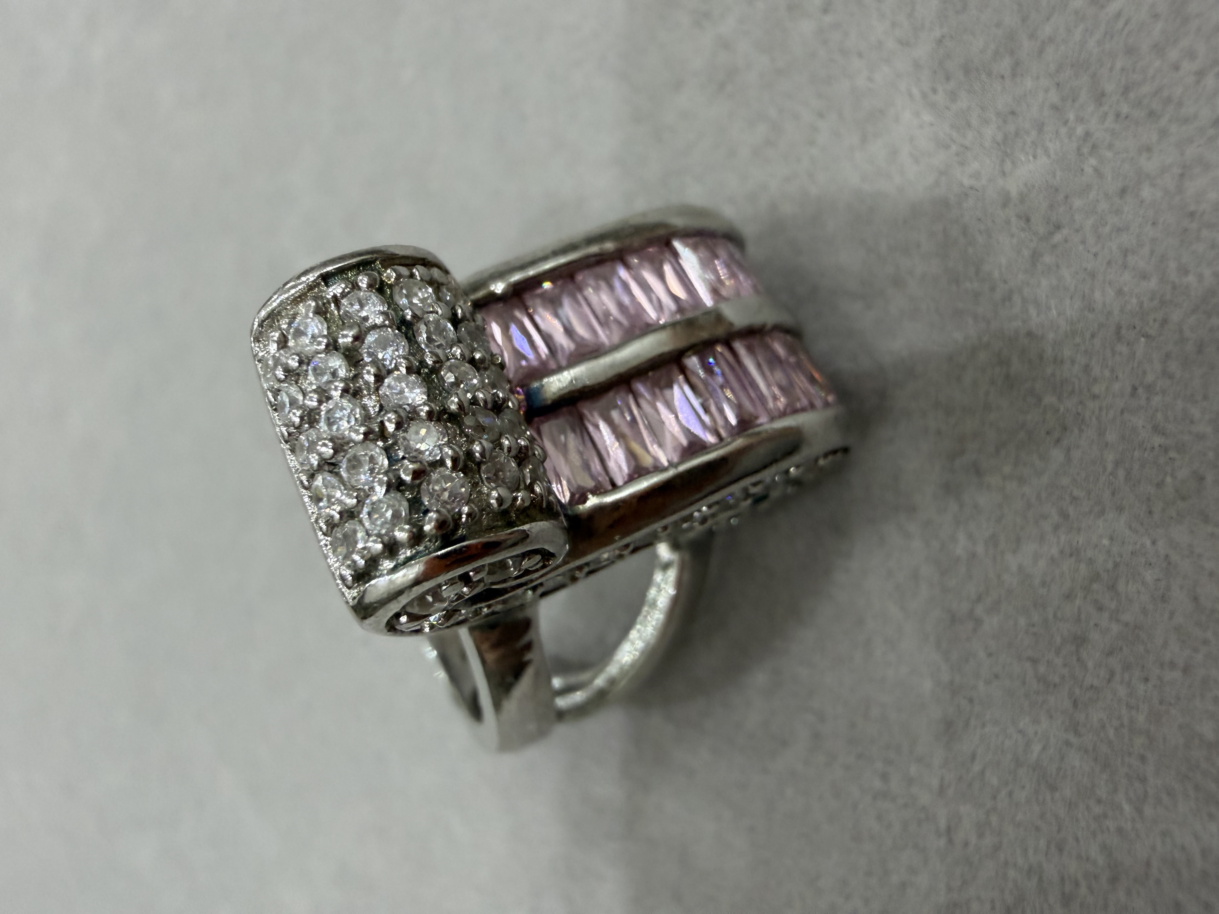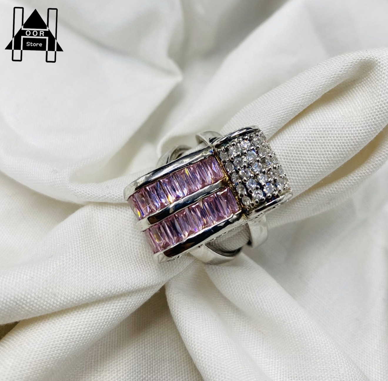 خاتم فضه نسائي عيار 925 مميز وأنيق بفصوص باللون الابيض والوردي . السعر / 120 ريال شامل الشحن والتوصيل لجميع مناطق المملكة .
