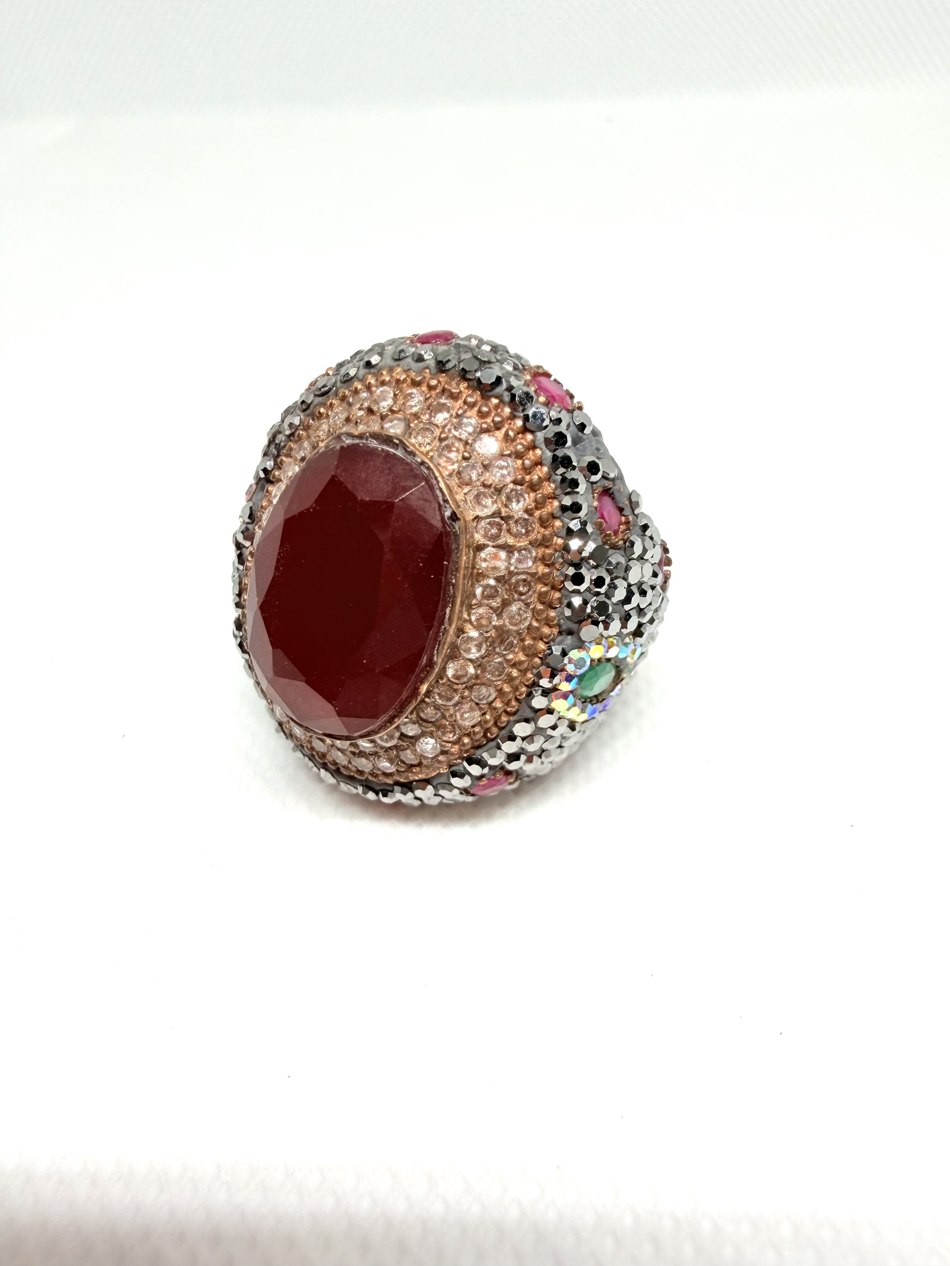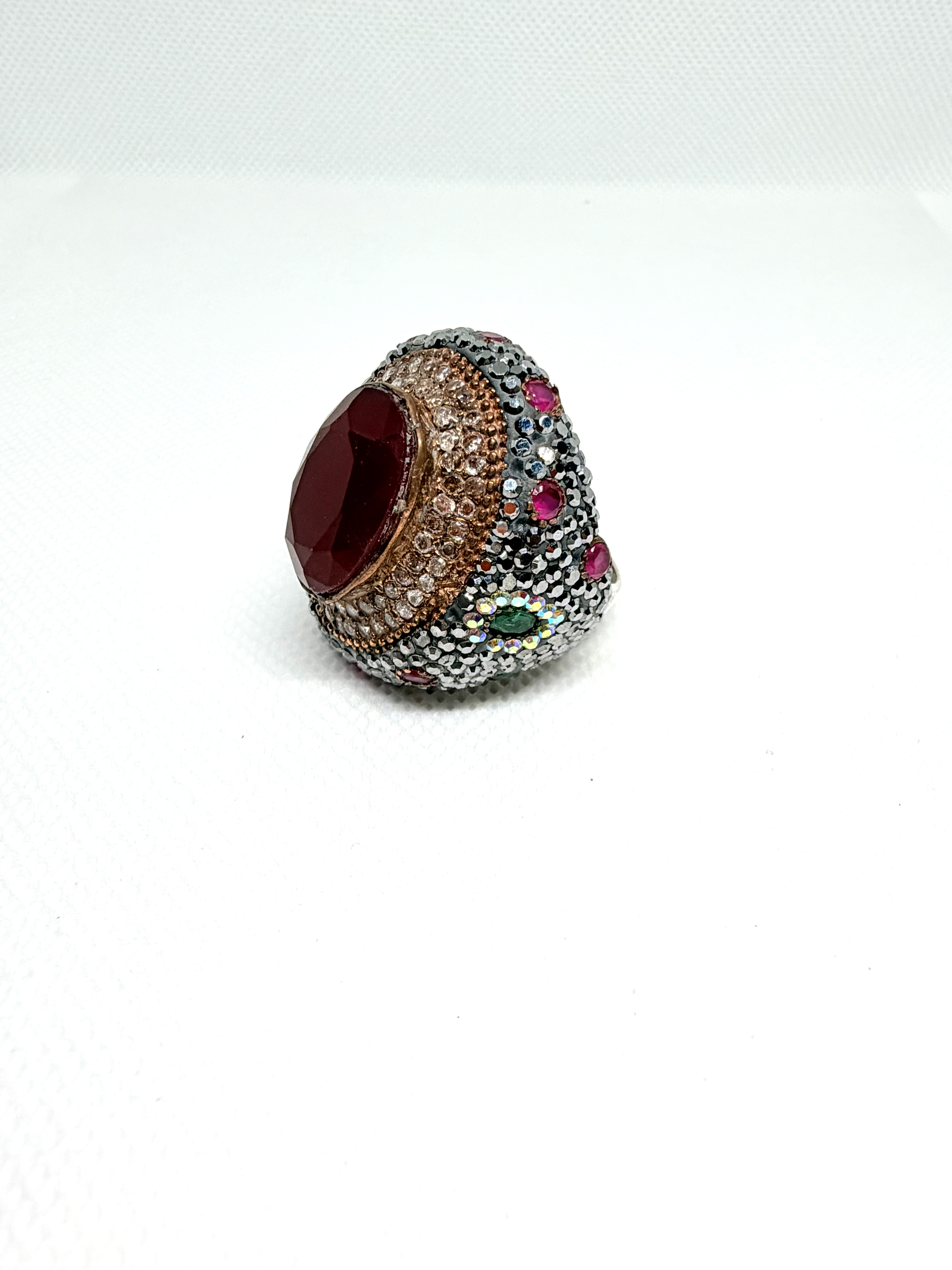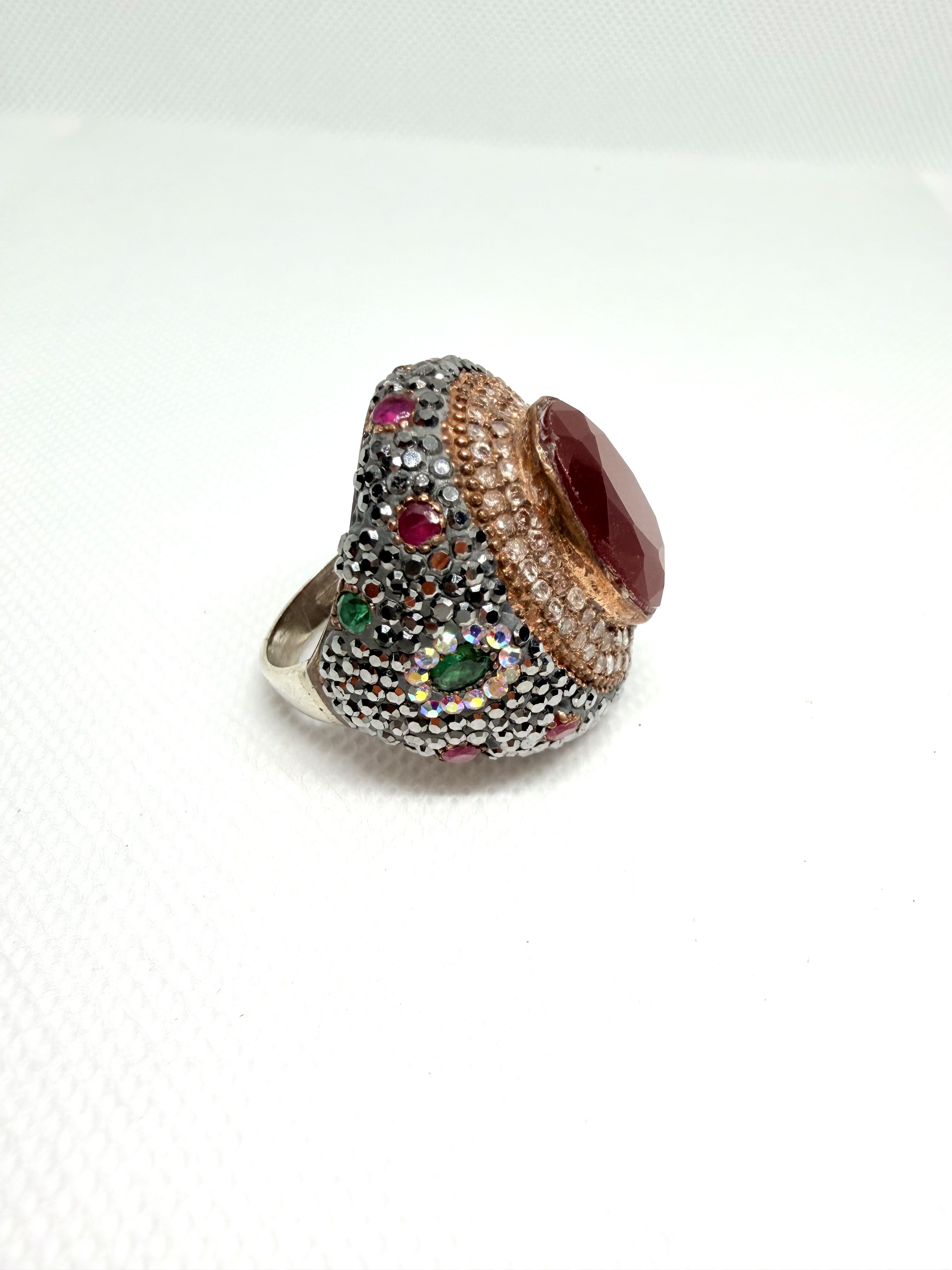 خاتم فضة ملكي فيكتوري فخم وراقي ونادر عيار 925 بتصميم عتيق متوج بحجر الياقوت الأحمر ( روبي ) الأفريقي الطبيعي ومحاط بأحجار الماركازيت الصغيرة وفصوص زركون ابيض في إطار مطلي بالذهب الوردي او البرونز واحجار زمرد اخضر وياقوت أحمر - ويتميز بتصميم كلاسيكي عتيق فيكتوري وبحجم راهي ومميز يجمع بين ألوان المعادن المتعددة والأحجار الكريمة مما يعطيه مظهراً ملكيًا فاخراً ومميزا. الخاتم جديد وليس مستخدم . قطعة نادرة لمحبي القطع والفضيات والأحجار الكريمة المميزة والثمينة والنادرة. المقاس / 10 الوزن /22 جرام . السعر / 750 ريال نهائي غير قابل للتفاوض . شحن وتوصيل لجميع مناطق المملكة للباب.