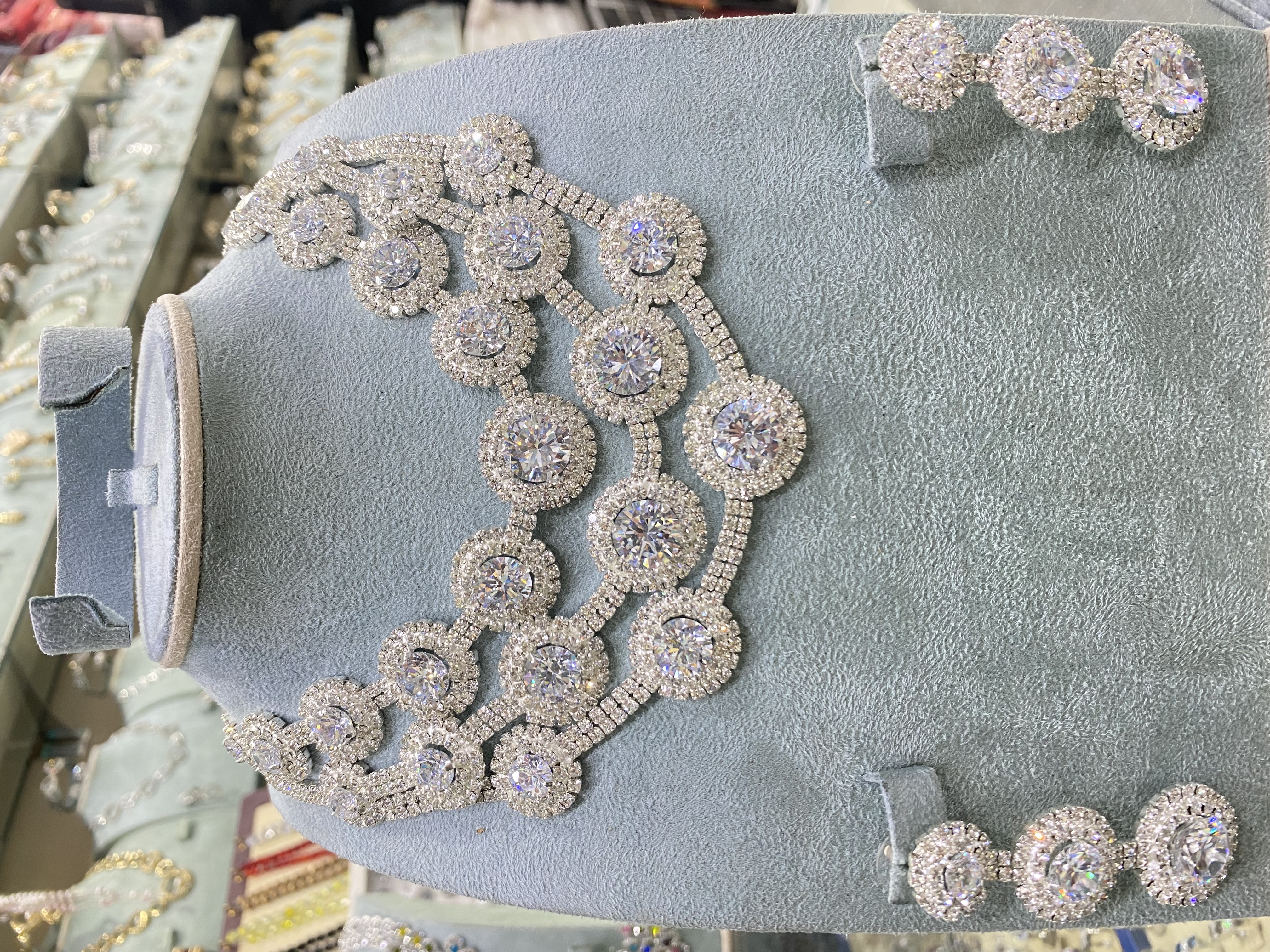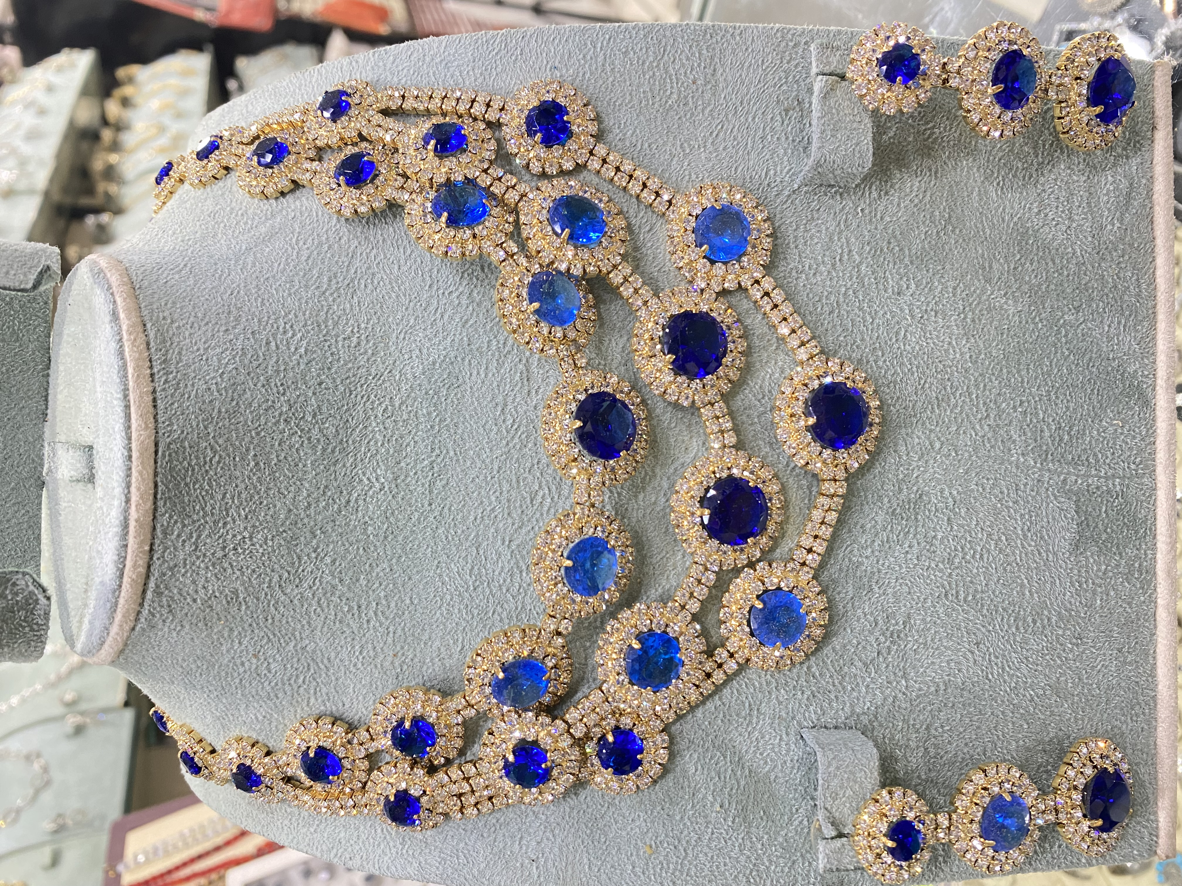 اطقم فاخرة ومميزة باللون الذهبي والفضي تنفع للحفلات والمناسبات بفصوص كريستال بيضاء وفصوص كريستال زرقاء - مكونة من / عقد كبير فاخر وخرصان - الطقوم جديدة . سعر الطقم الفضي / 137 ريال . سعر الطقم الذهبي / 155 ريال . الاسعار شاملة الشحن والتوصيل لجميع مناطق المملكة لباب المنزل.