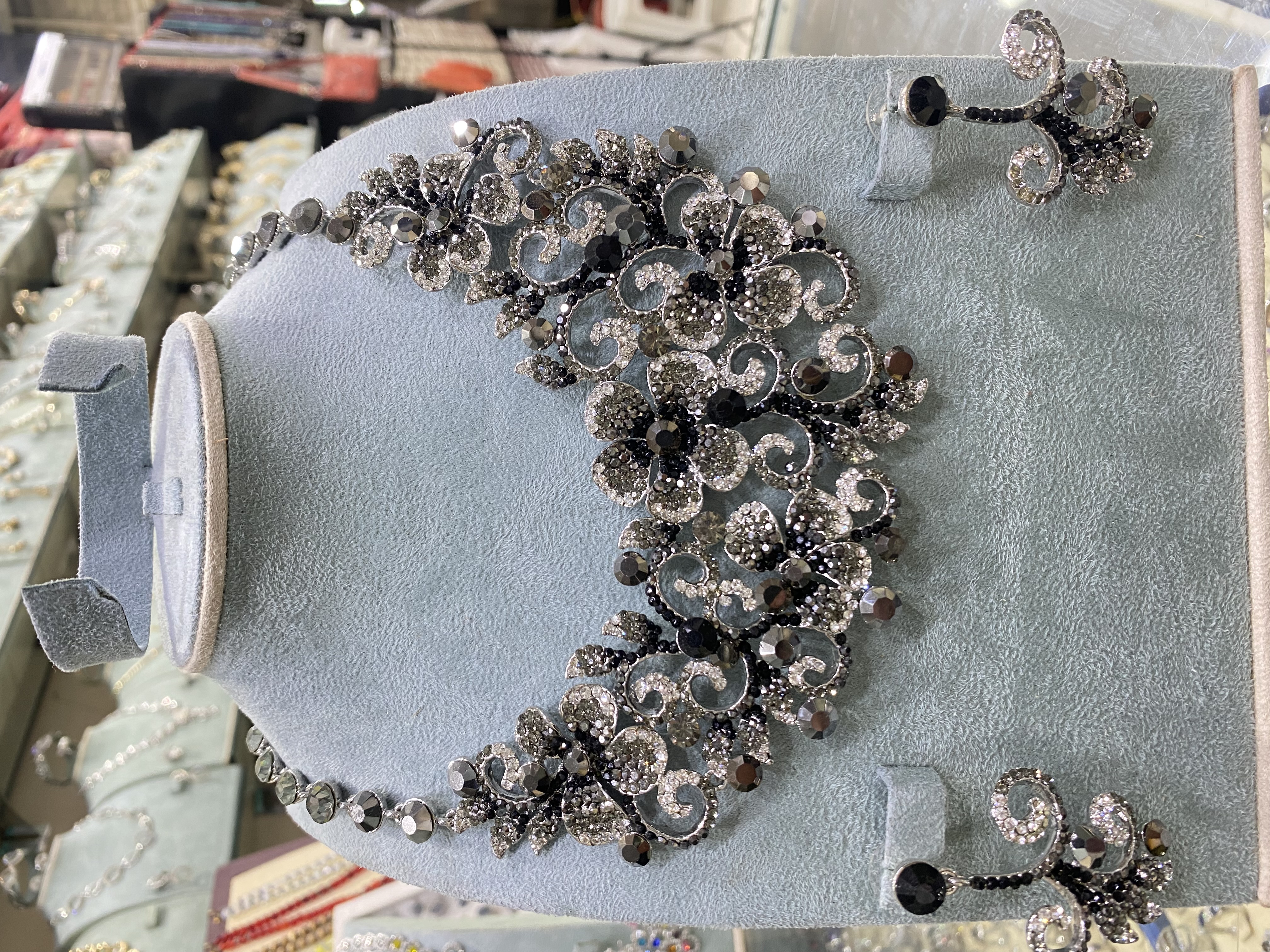 طقم إكسسوار راقي وفاخر بفصوص زركون ابيض واسود مكون من عقد فاخر وكبير وحلق مناسب لجميع الحفلات والسهرات - الطقم جديد - وبسعر مغري .