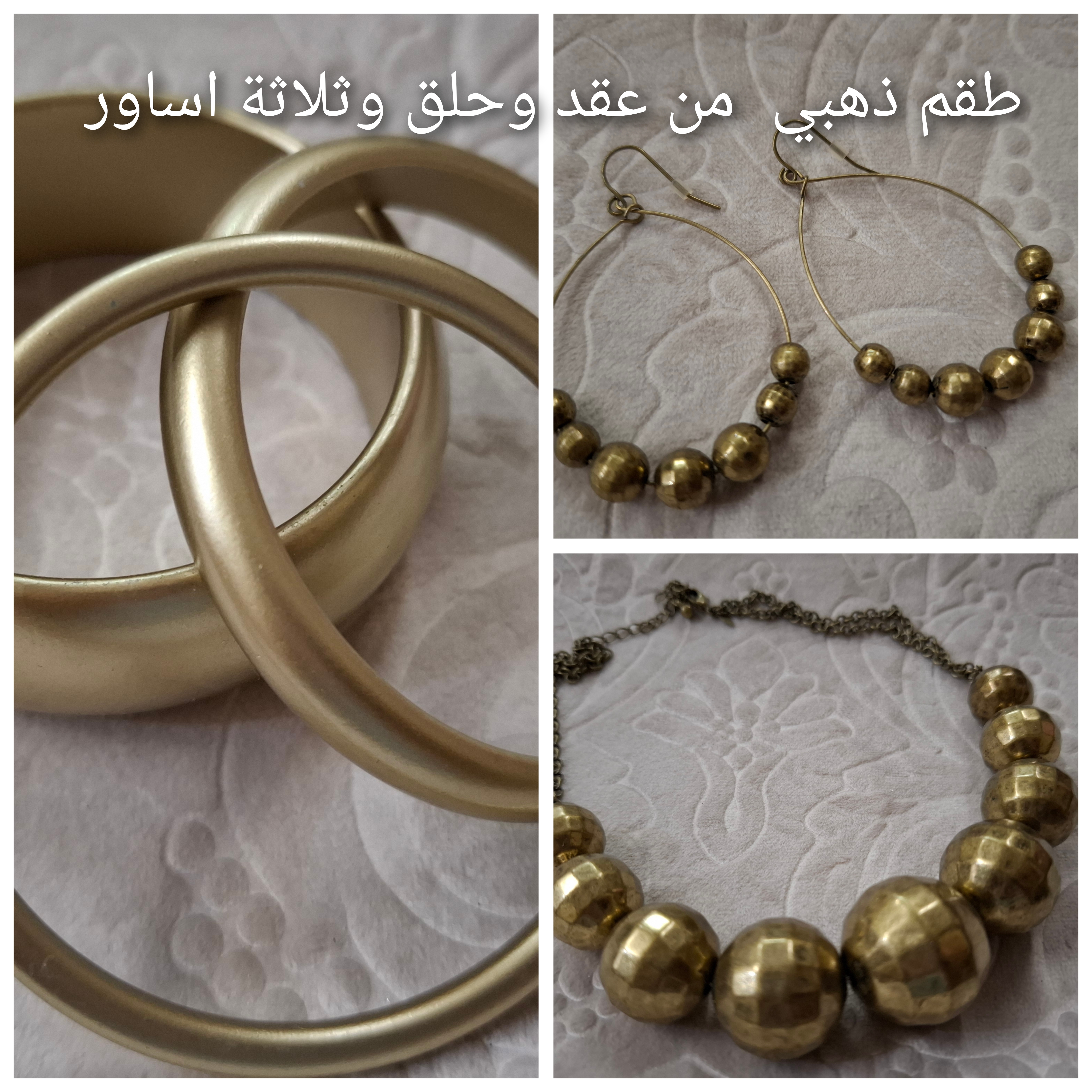 طقم ذهبي مكون من عقد وحلق و٣اساور كل قطعة ب١٠ ريال والطقم كامل ٢٥ ريال
